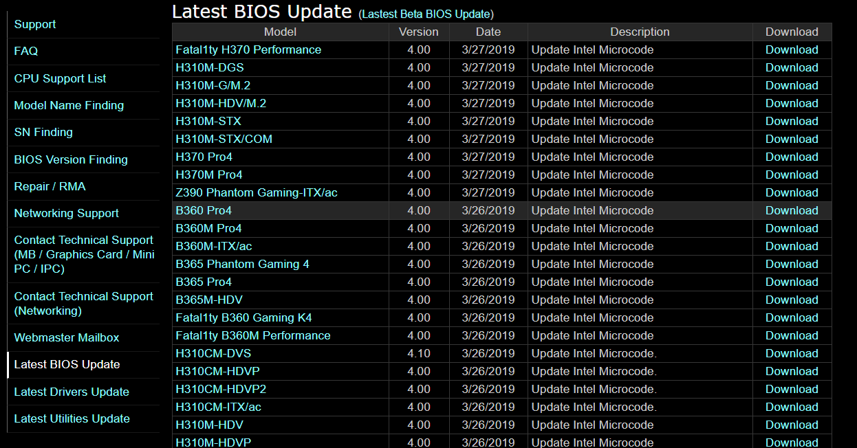 ASRock, 새 Core CPU 지원용 BIOS 업데이트 2019.03.28 01:48 PC.Div.Soft/News 반응형 - https://www.asrock.com/support/index.asp?cat=BIOS ASRock이 CPU Microcode 업데이트로 신규 CPU 지원에 필요한 업데이트를 제공하고 있습니다. ASUS, GIGABYTE, MSI보다 살짝 늦은게 아닌가 싶었는데 금방 해주네요. 아무튼 ASRock 보드 사용하는 분들이라면 업데이트 한번 체크해 보세염. 반응형 공유하기 게시글 관리 Klein Berry 'PC.Div.Soft > News' 카테고리의 다른 글 Intel, Wi-Fi 6 AX200 'Cyclone Peak' WLAN NIC 발표 (0) 2019.04.07 ASUS, AMD 300/400시리즈 칩셋 BIOS 업데이트(AGESA 0072) (0) 2019.03.28 ASUS/ASRock AMD X570 칩셋 머더보드 등록됨 (0) 2019.03.26 댓글 공유하기 다른 글 댓글 이 글 공유하기 구독하기 구독하기 카카오톡 카카오톡 라인 라인 트위터 트위터 Facebook Facebook 카카오스토리 카카오스토리 밴드 밴드 네이버 블로그 네이버 블로그 Pocket Pocket Evernote Evernote 다른 글 Intel, Optane메모리와 NAND를 결합한 고속 SSD 'Optane Memory H10' Intel, Optane메모리와 NAND를 결합한 고속 SSD 'Optane Memory H10' 2019.04.12 Intel, Wi-Fi 6 AX200 'Cyclone Peak' WLAN NIC 발표 Intel, Wi-Fi 6 AX200 'Cyclone Peak' WLAN NIC 발표 2019.04.07 ASUS, AMD 300/400시리즈 칩셋 BIOS 업데이트(AGESA 0072) ASUS, AMD 300/400시리즈 칩셋 BIOS 업데이트(AGESA 0072) 2019.03.28 ASUS/ASRock AMD X570 칩셋 머더보드 등록됨 ASUS/ASRock AMD X570 칩셋 머더보드 등록됨 2019.03.26 다른 글 더 둘러보기