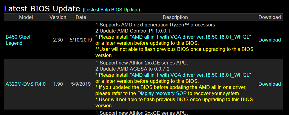 1.Supports AMD next generation Ryzen™ processors 2.Update AMD Combo_PI 1.0.0.1. * Please install "AMD all in 1 with VGA driver ver:18.50.16.01_WHQL" or a later version before updating to this BIOS. **User will not able to flash previous BIOS once upgrading to this BIOS version.