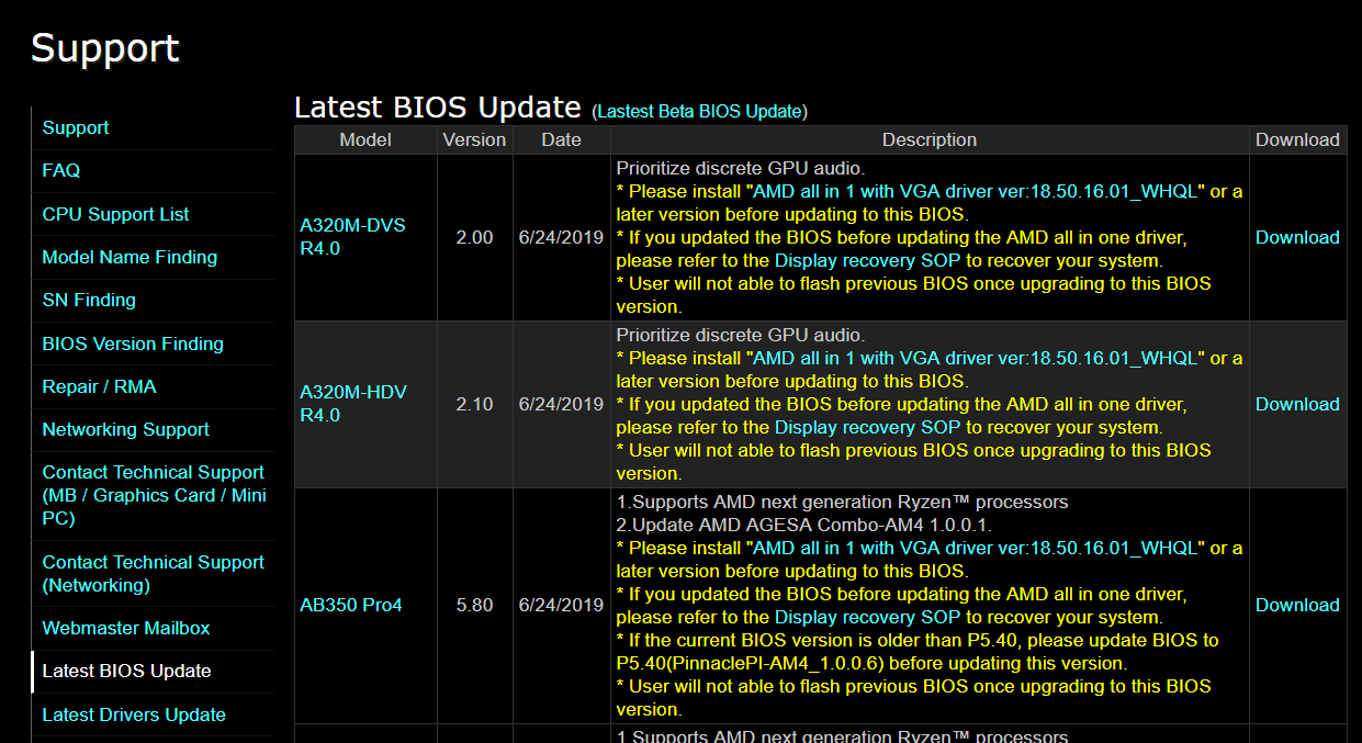 ASUS는 안그런데, ASRock이 7월 신규 Ryzen 프로세서 출시용으로 300시리즈 머더보드에 신규 AMD-ComboPI 1.0.0.1을 넣은 BIOS를 배포중이다. AGESA ComboPI의 최신 버전은 ASUS의 B450 제품으로 보면 1.0.0.2인 것 같고, 레딧 등에서 A320 칩셋에서도 온전한 Ryzen 3000시리즈 CPU를 지원하는(대게 APU만 지원) 것 같다는 루머들도 돌고 있는 거 보면(MSI는 A320에서 브리스톨릿지 지원 빼버린 듯) 차차 진행 사항을 지켜봐야 하겠지만....