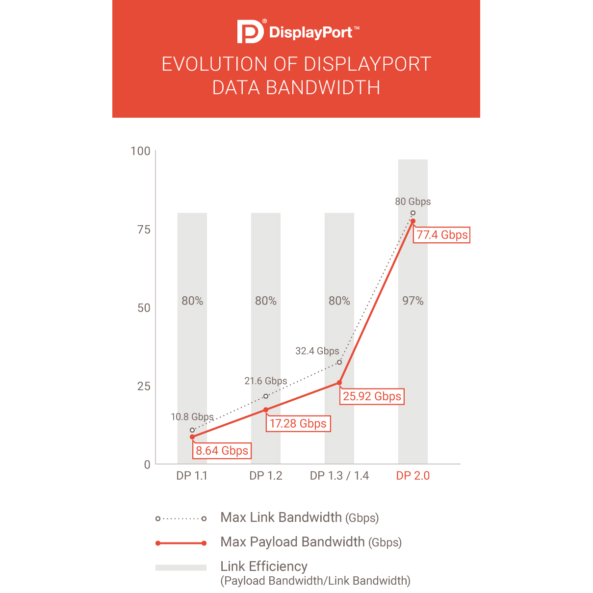 2016년 발표한 DisplayPort 1.4a에선 1레인이 8.1Gbps로 최대 대역폭 32.4Gbps(4레인), 8b/10b 채널 코딩으로 25.92Gbps의 최대 전송 속도를 지녔었는데요, 이번 2.0에서는 레인당 20Gbps가 되어 보다 효율적인 128b/132b 채널 코딩으로 최대 전송 속도는 77.37Gbps로 확장되었다고 합니다.
