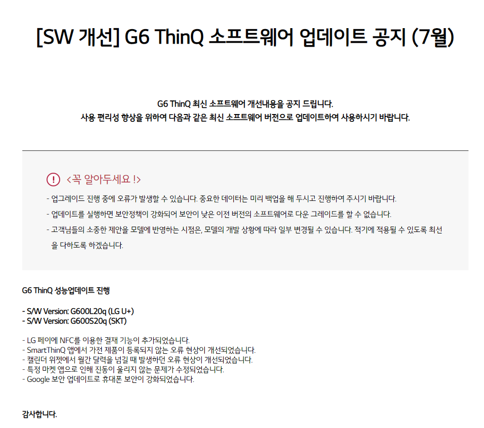 LG G6 ThinQ 7월 보안 업데이트 2019.07.10 23:19 ETC.Mobile/Phone.Console 반응형 - https://www.lge.co.kr/lgekor/contents/mobile/swUpgradeList.do?cateId=0200&type=notice 3분기 파이 업데이트인데 이렇게나 빨리? 하고 살짝 설랬었음.... 아무튼 보안 업데이트가 있으니까 사용하시는 분들이라면 업데이트 한번 체크해 보세염. 반응형 공유하기 게시글 관리 Klein Berry 'ETC.Mobile > Phone.Console' 카테고리의 다른 글 LG, V20 Pie 업데이트, G6 업데이트 (0) 2019.10.31 LG, G5 오레오 업데이트 시작 (0) 2018.08.31 LG V20 오레오 업데이트 (0) 2018.08.29 댓글 공유하기 다른 글 댓글 이 글 공유하기 구독하기 구독하기 카카오톡 카카오톡 라인 라인 트위터 트위터 Facebook Facebook 카카오스토리 카카오스토리 밴드 밴드 네이버 블로그 네이버 블로그 Pocket Pocket Evernote Evernote 다른 글 LG G7 ThinQ, 안드로이드 10 업데이트 LG G7 ThinQ, 안드로이드 10 업데이트 2020.05.18 LG, V20 Pie 업데이트, G6 업데이트 LG, V20 Pie 업데이트, G6 업데이트 2019.10.31 LG, G5 오레오 업데이트 시작 LG, G5 오레오 업데이트 시작 2018.08.31 LG V20 오레오 업데이트 LG V20 오레오 업데이트 2018.08.29 다른 글 더 둘러보기