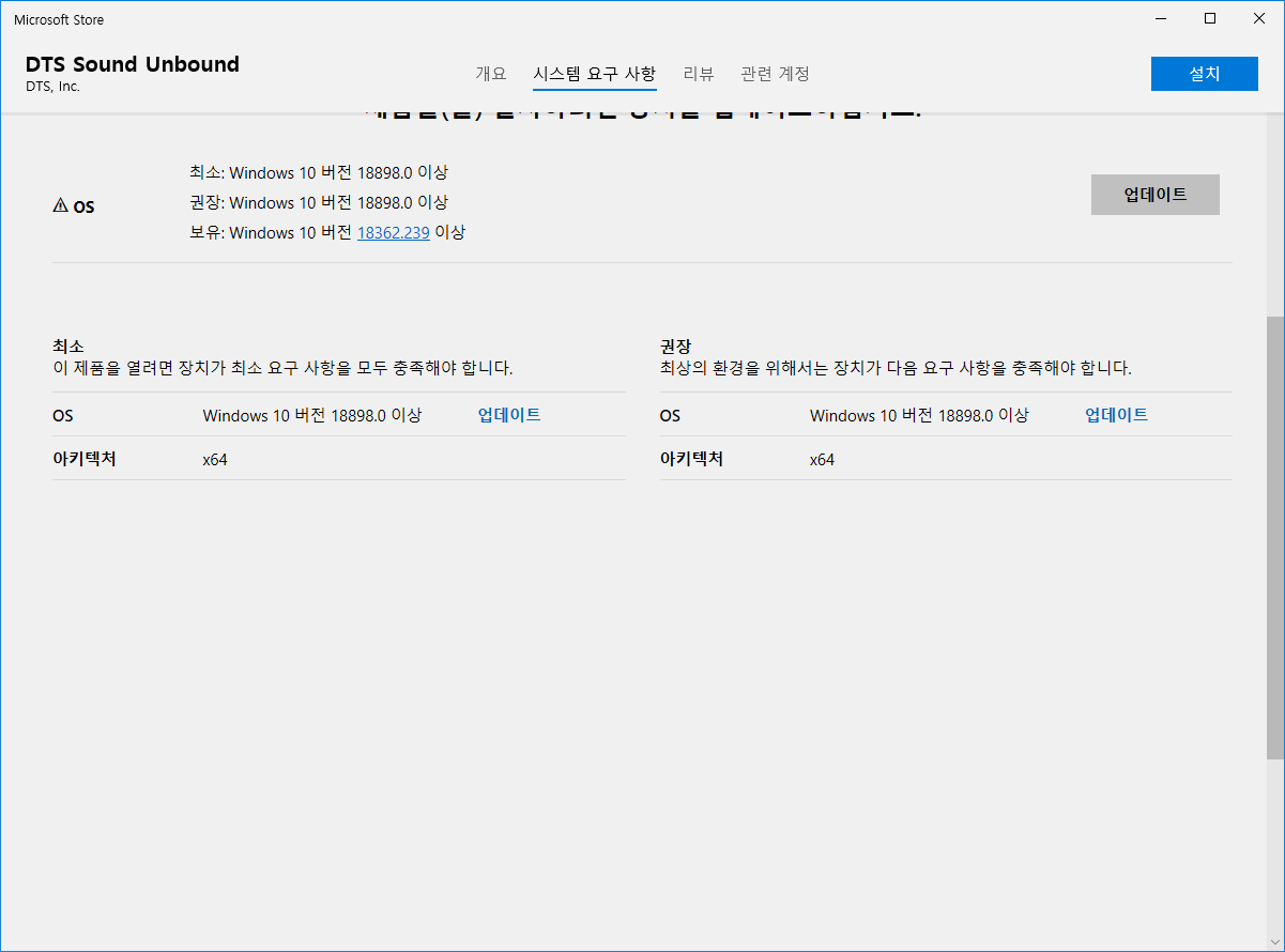 DTS 가상 사운드 효과앱이 MS스토어에 등록된지도 꽤 지났는데, 아직 구매하거나 사용하는 방법이 없어 매번 업데이트체크때마다 확인해보는데 이번에 확인해보다 발견. 최소 OS 요구 기준이 x64, Windows 10 18898 버전을 요구함.