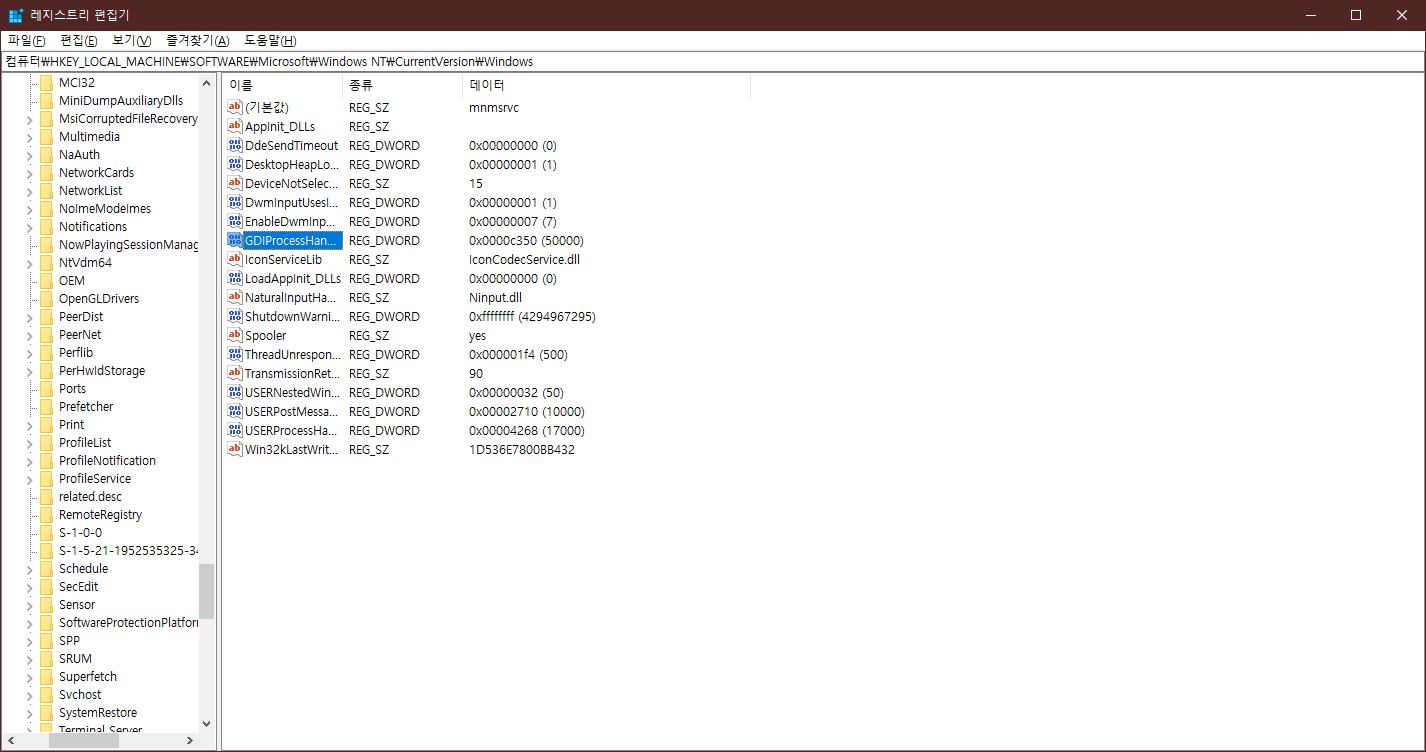 의 레지스트리 값을 바꿔주면 된다. 위에 값의 범위는 256-65536, 기본값 10000, 아래값은 200-18000, 기본값 10000이라고 하니 참조합시다. 적용후엔 재시작 필요함.