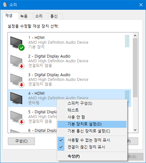 HDMI 연결시 모니터에서 소리가 안날 때