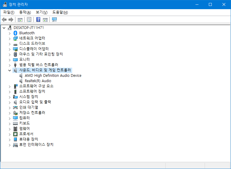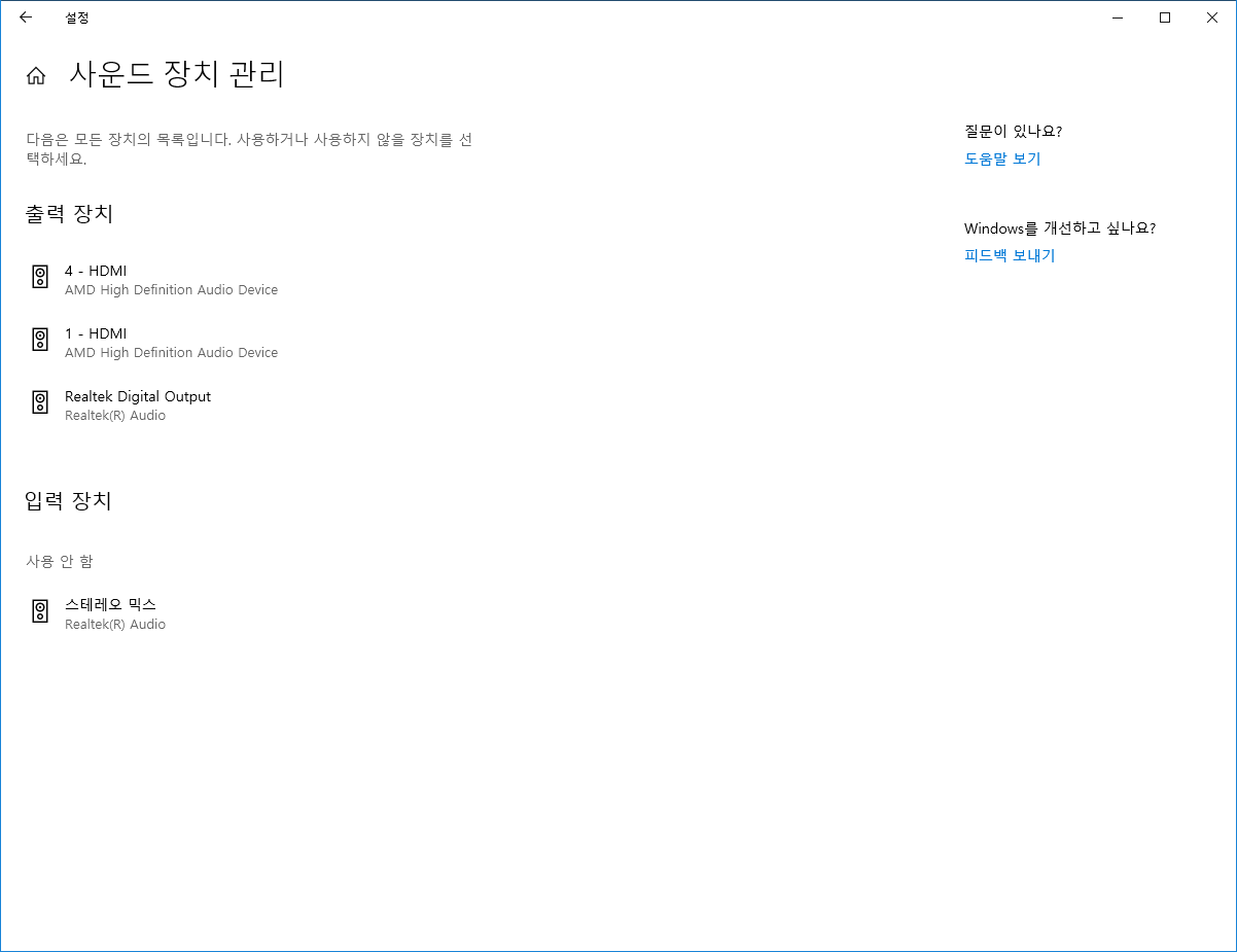 2. 그래도 안들린다면, 장치 관리자를 열어서 드라이버가 올바르게 잡혀 있는지 확인합시다. 사실 위에서 설정하면 대부분 연동되던데, 윈10은 장치관리자에서 비활성화 했다가 풀어도 위에 설정에서 다시 풀리지 않는 경우가 종종 있어서; 일단 아래에 별다른 느낌표 표시나 이런게 없다면 큰 문제는 없다고 생각이 되는데, 사운드, 비디오 및 게임 컨트롤러에 있는 각 장치들을 한번씩 마우스 오른쪽 클릭해 디바이스 사용 안 함으로 한 번 했다가 다시 사용함으로 만들어 보면 가끔 돌아오는 경우가 있었으니 참조하세욥.