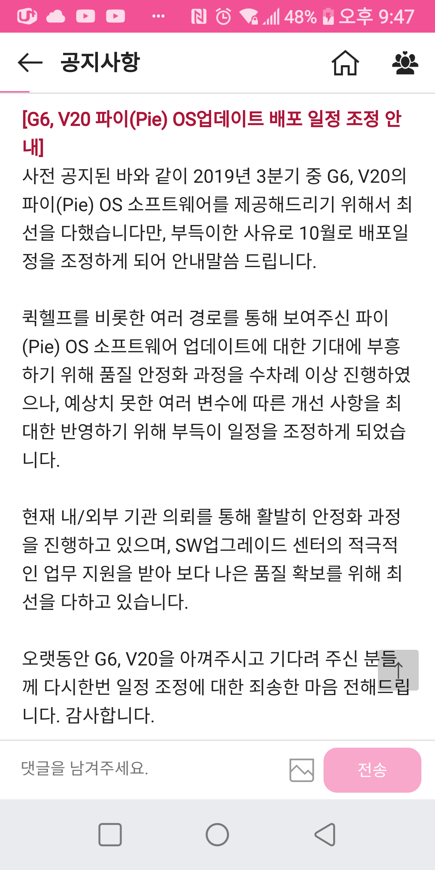 LG V20, G6 파이 업데이트 10월로 연기 2019.09.30 22:35 ETC.Mobile 반응형 9월 마지막날인데 어떻게 되나...하고 기다리다 퀵헬프 들어가봄. 다른 폰 올려주고 천천히 해주는건 좀 얄밉긴하다. 아무튼 10월 중 업데이트한다고 하니 조금만 더 기다려보아요. 근데 요즘 G7도 중고 십만원 중반이던데(....;) 반응형 공유하기 게시글 관리 Klein Berry 'ETC.Mobile' 카테고리의 다른 글 Fiio M3K 펌웨어 업데이트(1.4.3) (0) 2019.10.06 Xiaomi 70mai Dash Cam Pro 펌웨어 업데이트 (0) 2019.09.20 삼성 마스터폰(SM-B510S) 펌웨어 업데이트 (0) 2019.08.28 댓글 공유하기 다른 글 댓글 이 글 공유하기 구독하기 구독하기 카카오톡 카카오톡 라인 라인 트위터 트위터 Facebook Facebook 카카오스토리 카카오스토리 밴드 밴드 네이버 블로그 네이버 블로그 Pocket Pocket Evernote Evernote 다른 글 LG G6 등 PC로 USB 연결이 잘 안될 때 LG G6 등 PC로 USB 연결이 잘 안될 때 2019.10.06 Fiio M3K 펌웨어 업데이트(1.4.3) Fiio M3K 펌웨어 업데이트(1.4.3) 2019.10.06 Xiaomi 70mai Dash Cam Pro 펌웨어 업데이트 Xiaomi 70mai Dash Cam Pro 펌웨어 업데이트 2019.09.20 삼성 마스터폰(SM-B510S) 펌웨어 업데이트 삼성 마스터폰(SM-B510S) 펌웨어 업데이트 2019.08.28 다른 글 더 둘러보기