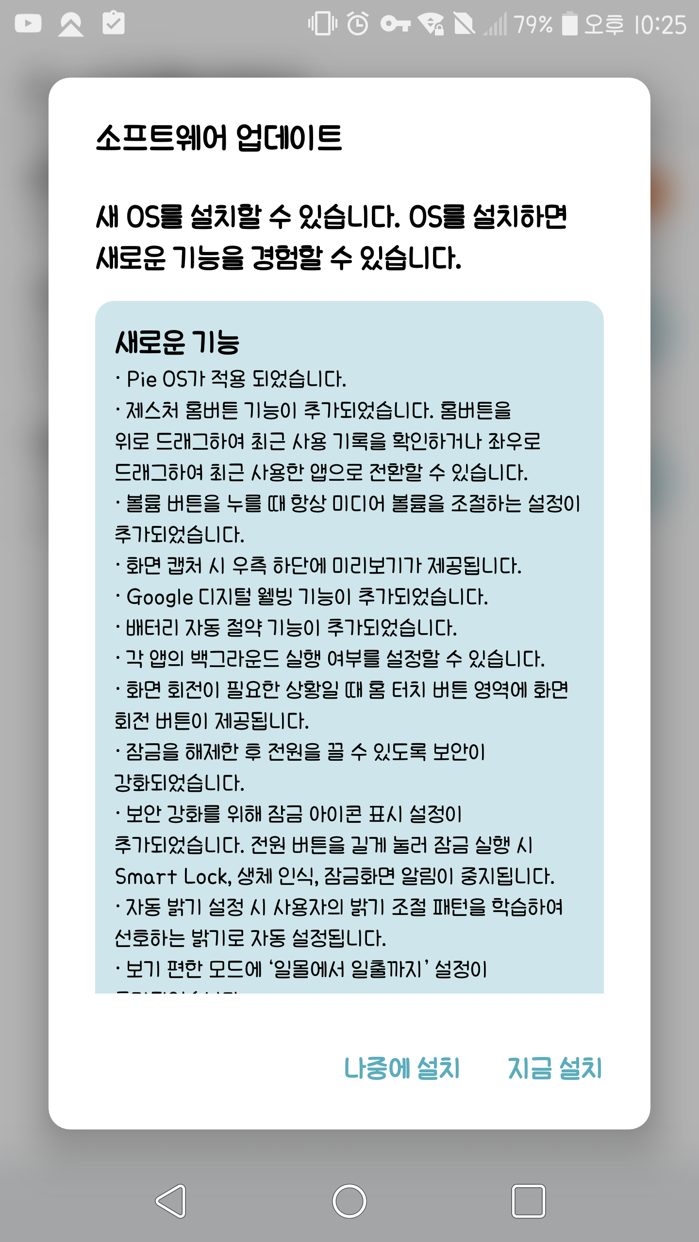 참고로 업데이트 내역에 자동 밝기가 학습해서 선호하는 밝기로 조정된다고 되어 있는데 자동 밝기해두고 밤에 낮은 밝기로 쓰면 낮에도 밝기가 확 떨어짐. 이전부터 쭉 노바런쳐 쓰고 있어서 UI 변화는 잘 모르겠고, 아이콘은 변한 것 같다. UI간 효과 속도가 조금 빨라진 듯 하고, V30이나 Q9에서 느꼈던 WiFi 끊김 버그 등은 없는 거 같아서 만족. 아무튼 고마워요 LG.