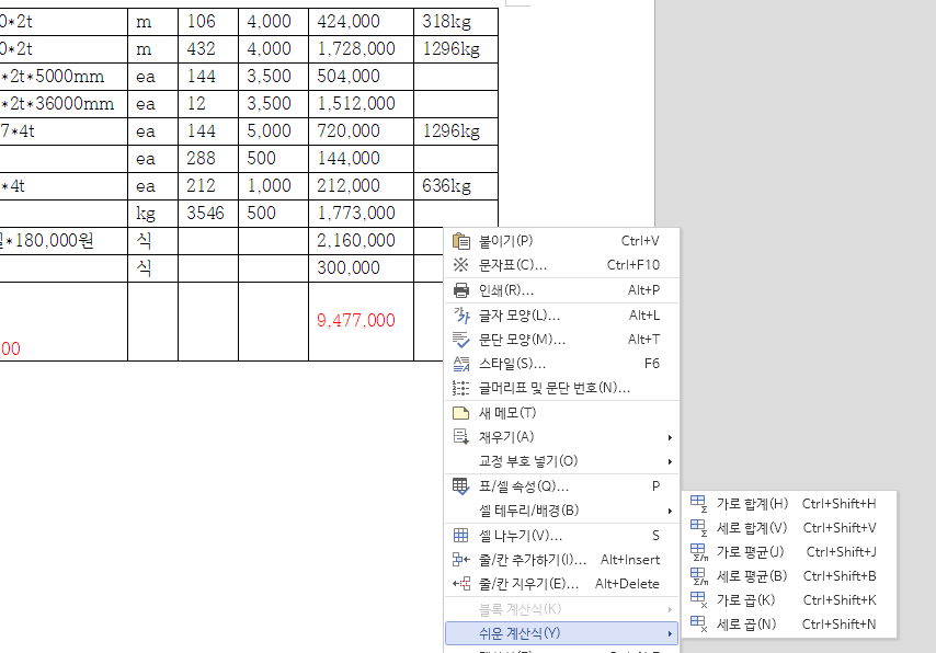 *함수 사용은 엑셀이랑 비슷하고, 위 도움말 읽어보면서 하면 좀 더 이해가 빠르다. 근데 좀 더 자세한 작업은 엑셀 등에서 하는 게 편하니 엑셀 쓰면 되고, 가로 합계 등은 오른쪽 버튼 눌러서 바로바로 적용할 수 있다.