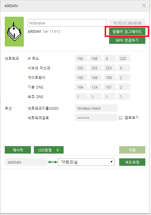 [EasyMesh 관리 툴] 에서 콘트롤러를 선택한 후 아래 그림처럼 [ 펌웨어 업그레이드 ] 버튼을 클릭하면,