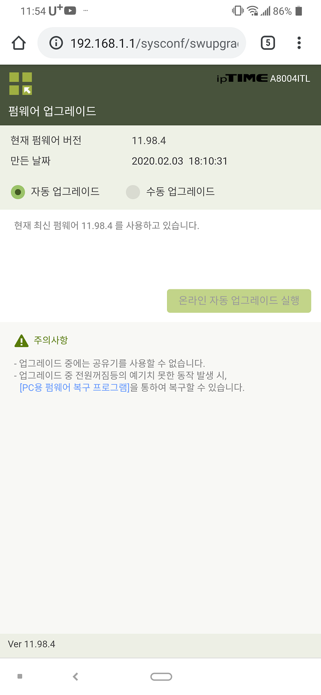 개인적으로 모바일 UI에서 펌웨어 자동 업데이트를 하면 잘 안되던 경우가 있어서 대게 PC에서 수동으로 진행하게 됨. 그리고 A8004ITL의 2.4GHz 호환 문제는 여전하다.....(.....).