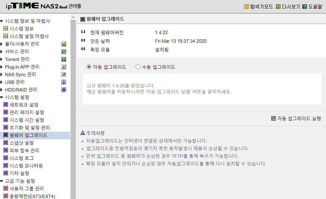 EFM, ipTIME NAS 시리즈 펌웨어 업데이트(1.4.26) 2020.04.22 23:58 ETC.Mobile/Nas.HomeLab 반응형 다운로드 페이지: https://iptime.com/iptime/?page_id=126&pageid=1&mod=list&x=0&y=0&keyword=1.4.26 NAS 서비스의 UPNP 자동 등록 옵션 추가, 일부 USB 메모리 인식 관련 버그가 해결된 버전. EFM에서는 1.4.24 버전의 문제로 '관리툴 > 서비스 관리 > IP CAM 서비스'에 등록된 정보를 모두 삭제하고 물리 전원버튼으로 시스템을 종료 및 새롭게 부팅하여 업그레이드를 진행하라고 적혀 있음. 다운로드 페이지에서 사용중인 모델의 내역을 체크해 보도록 합시다. 반응형 공유하기 게시글 관리 Klein Berry 'ETC.Mobile > Nas.HomeLab' 카테고리의 다른 글 EFM, ipTIME NAS 펌웨어 1.4.34.36 배포 (0) 2020.07.08 Synology DSM 6.2.3-25423 업데이트 (0) 2020.04.19 EFM, ipTIME NAS 시리즈 펌웨어 1.4.22 업데이트 (0) 2020.03.28 댓글 공유하기 다른 글 댓글 이 글 공유하기 구독하기 구독하기 카카오톡 카카오톡 라인 라인 트위터 트위터 Facebook Facebook 카카오스토리 카카오스토리 밴드 밴드 네이버 블로그 네이버 블로그 Pocket Pocket Evernote Evernote 다른 글 EFM, ipTiME NAS dual 시리즈 펌웨어 업데이트 EFM, ipTiME NAS dual 시리즈 펌웨어 업데이트 2020.11.03 EFM, ipTIME NAS 펌웨어 1.4.34.36 배포 EFM, ipTIME NAS 펌웨어 1.4.34.36 배포 2020.07.08 Synology DSM 6.2.3-25423 업데이트 Synology DSM 6.2.3-25423 업데이트 2020.04.19 EFM, ipTIME NAS 시리즈 펌웨어 1.4.22 업데이트 EFM, ipTIME NAS 시리즈 펌웨어 1.4.22 업데이트 2020.03.28 다른 글 더 둘러보기