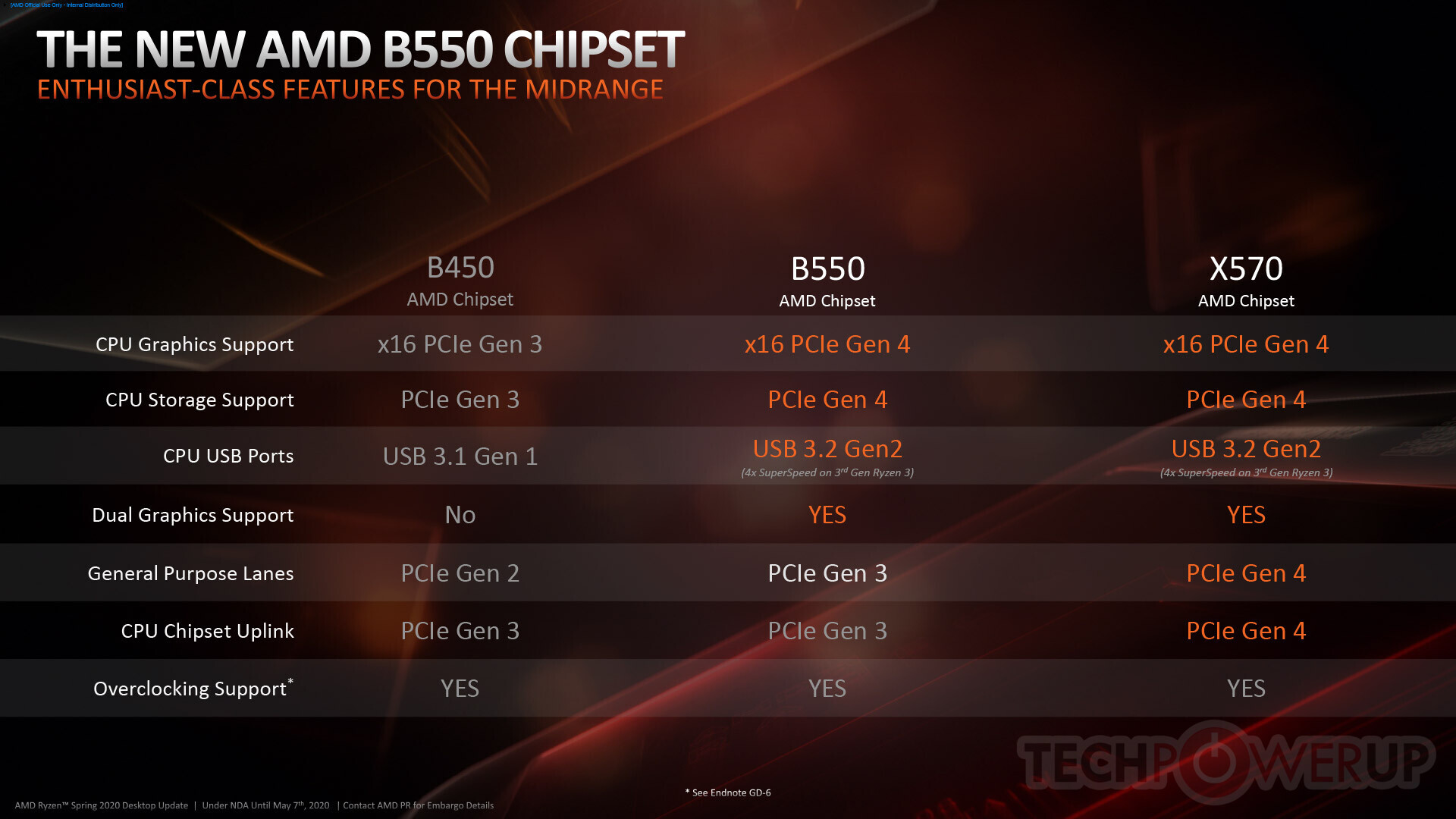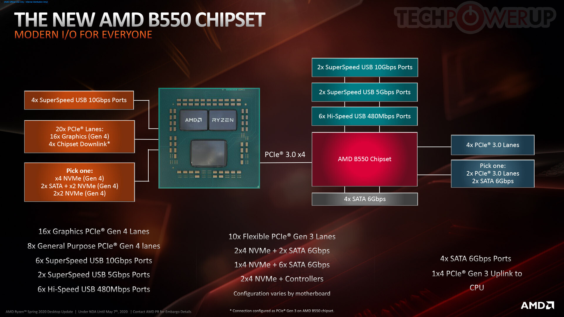 조금 더 상세한 정보를 봅면 이 AMD B550 칩셋을 사용한 머더보드는 PCIe 4.0을 지원할 것이며(Ryzen 프로세서 제공), 칩셋이 가지는 레인은 PCIe 3.0일 것이라고 합니다. PCIe 2.0을 사용하는 B450 칩셋과 비교해 좀 더 빠른 속도로 프로세서와 통신할 수 있고, 이전 세대 칩셋에서는 X470/570에서만 가능했던 멀티 GPU 지원에 필요한 x16 레인을 x8,x8 로 나누는 것도 지원한다고 하네요. (이미지에서는 오타인 듯 하고, 2개의 10Gbps USB 포트도 지원하는 것 같습니다. CPU/메모리 오버는 기본이고요.