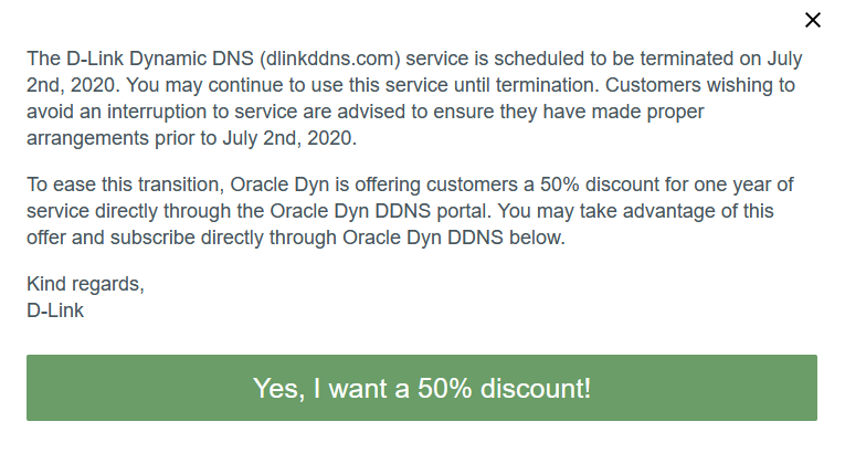 868L, 850L 등으로 등록해놨던 메일로 공지가 날라옴 dyndns의 서비스를 무료로 이용 가능했던 것으로 기억하는데, 아마 . dlinkddns.com에 접속해보면 2020년 6월 2일을 지검으로 끝난다고 함. 다만 오늘날에야 여러 무료 DDNS 서비스 업체도 있고, NAS 등을 쓰고 있다면 여기서도 주기도 하니 별 문제는 안되지 않나 싶음.