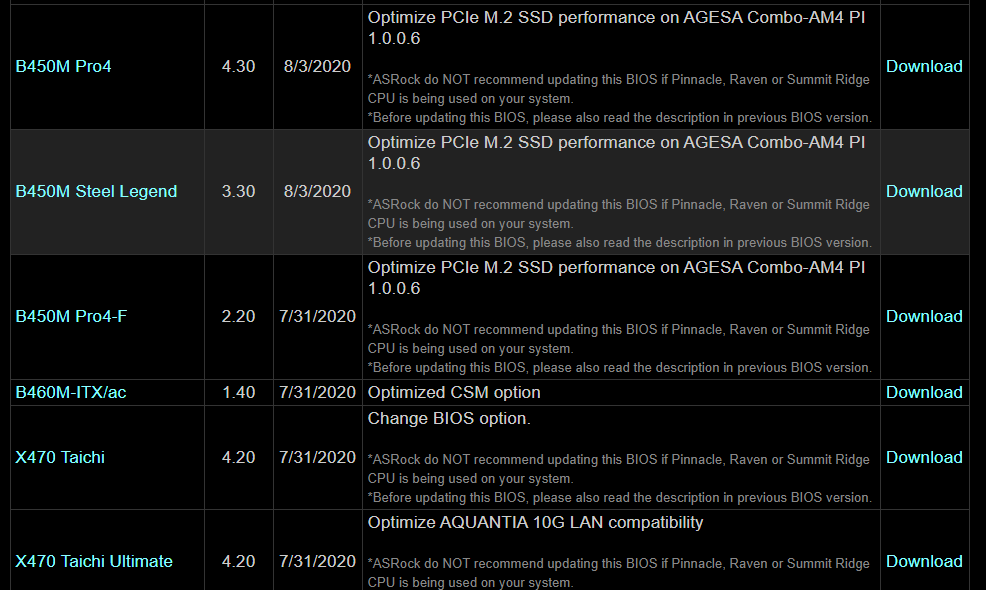 ASRock, 자사 AMD 400시리즈 머더보드 BIOS 업데이트 2020.08.08 17:12 PC.Div.Soft/Driver.Firmware 반응형 얼마전에 있었던 레딧의 글에 따른 신규 AGESA Combo-PI AM4 1.0.0.6 기반의 BIOS 업데이트 후 NVMe 성능이 저하되던 문제를 수정한 3.30 버전의 BIOS가 등록되었습니다. B450M Steel Legend 및 B450M Pro4-F 등 ASRock AMD B450시리즈 머더보드들의 신규 바이오스가 등록되었으니 사용하시는 분들을 업데이트를 챙겨보시기 바랍니다. 반응형 공유하기 게시글 관리 Klein Berry 'PC.Div.Soft > Driver.Firmware' 카테고리의 다른 글 MSI MPG Z390 GAMING EDGE AC BIOS 업데이트 (0) 2020.08.11 HP 파빌리온 - 15-cs3011tx BIOS 업데이트(F.10 Rev.A) (0) 2020.08.02 HP-14s-dk0112/0113au BIOS 업데이트(F.55 Rev.A) (0) 2020.07.31 댓글 공유하기 다른 글 댓글 이 글 공유하기 구독하기 구독하기 카카오톡 카카오톡 라인 라인 트위터 트위터 Facebook Facebook 카카오스토리 카카오스토리 밴드 밴드 네이버 블로그 네이버 블로그 Pocket Pocket Evernote Evernote 다른 글 HP-14s-dk0112/0113au BIOS 업데이트(F.56 Rev.A) HP-14s-dk0112/0113au BIOS 업데이트(F.56 Rev.A) 2020.08.14 MSI MPG Z390 GAMING EDGE AC BIOS 업데이트 MSI MPG Z390 GAMING EDGE AC BIOS 업데이트 2020.08.11 HP 파빌리온 - 15-cs3011tx BIOS 업데이트(F.10 Rev.A) HP 파빌리온 - 15-cs3011tx BIOS 업데이트(F.10 Rev.A) 2020.08.02 HP-14s-dk0112/0113au BIOS 업데이트(F.55 Rev.A) HP-14s-dk0112/0113au BIOS 업데이트(F.55 Rev.A) 2020.07.31 다른 글 더 둘러보기