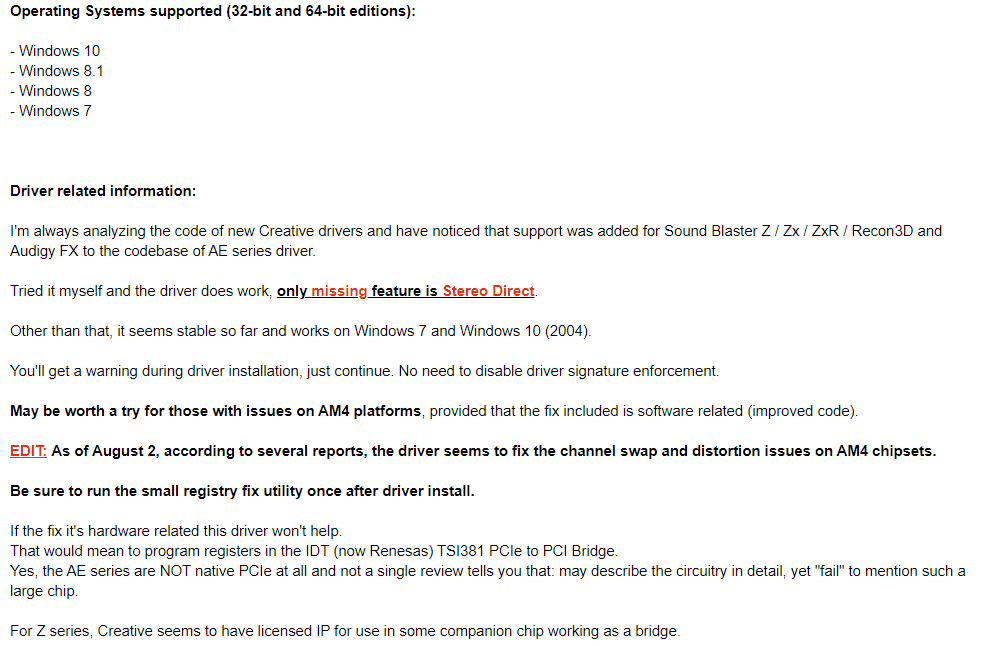 이젠 드라이버 업데이트조차 없는 사블 Z, Zx, ZxR, Recon 3DPCIe 베타 지원이 추가되었다고함. 스테레오 다이렉트 기능은 미지원이라고 하며, AM4 칩셋에서 생기는 드라이버 관련 문제를 해결하는 것처럼 보인다고 하니 필요한 사람은 한번 체크를 해보시길.