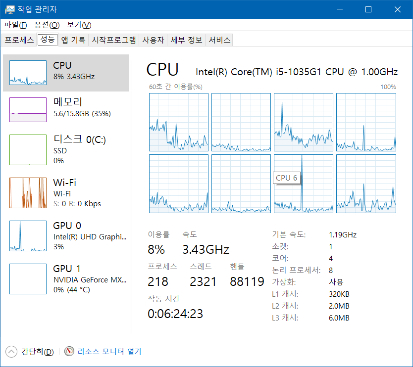 전원 옵션 조정이 가능하다면 고성능으로 바꿔보겠지만 노트북은.... 세세하게 설정할 수 있는 게 적다보니; 최소 프로세서 전원 상태라도 만져볼까....
