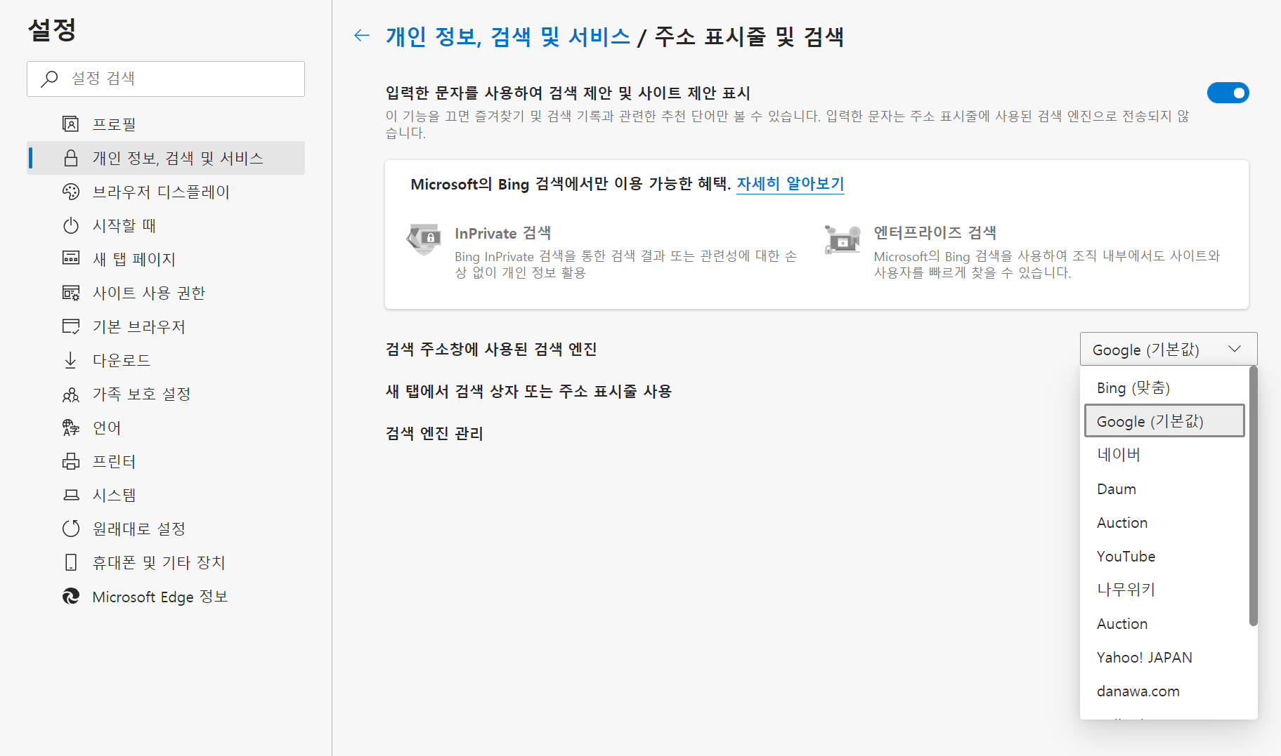 브라우저 오른쪽 상단 ... > 설정 > 설정 화면에서 왼쪽 개인 정보, 검색 및 서비스 부분 > 검색 주소창에 사용된 검색 엔진 부분에서 드롭다운 메뉴를 눌러 Google이나 자기가 사용하는 검색엔진으로 설정해두면 되니 참조합시다.