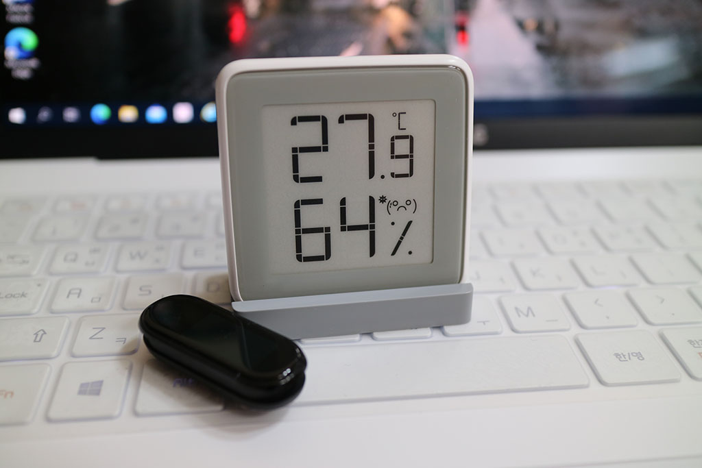 미 앱이 미묘해서 이제는 안 쓰는 미 밴드 4와의 크기 비교. 노트북의 키 고려해보면 생각보다 되게 작은 걸 확인(제품 높이가 검지손가락만함)해 볼 수 있는데 그래도 액성에 커다랗게 온습도만 나와서 가시성은 되게 좋음. 다만 백라이트 이런 거 없어서 밤에는 당연하겠지만 밤에는 안 보임.