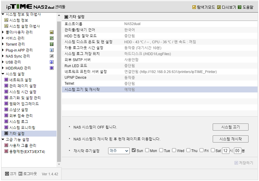 24시간 켜져 있는데 사실 당연하기도 하고, 종종 가보면 업타임 2년이 되가는 경우도 있는 것 같은데 스마트폰도 그렇고 공유기도 그렇고 NAS도 그렇고 종종 재시작해주고 펌업도 좀 해주는 게 여러모로 예상치 못했던 오류 등도 잡고 보안 문제도 해결할 수 있는 방법이되기도 하니까 설정해서 사용하도록 합시다. 근데 생각보다 이거 설정 안하고 쓰는 사람들 꽤 되더라. 쓰는데 별 문제 없으면 사실 아무것도 안 건들이는 게 최고긴 하지...