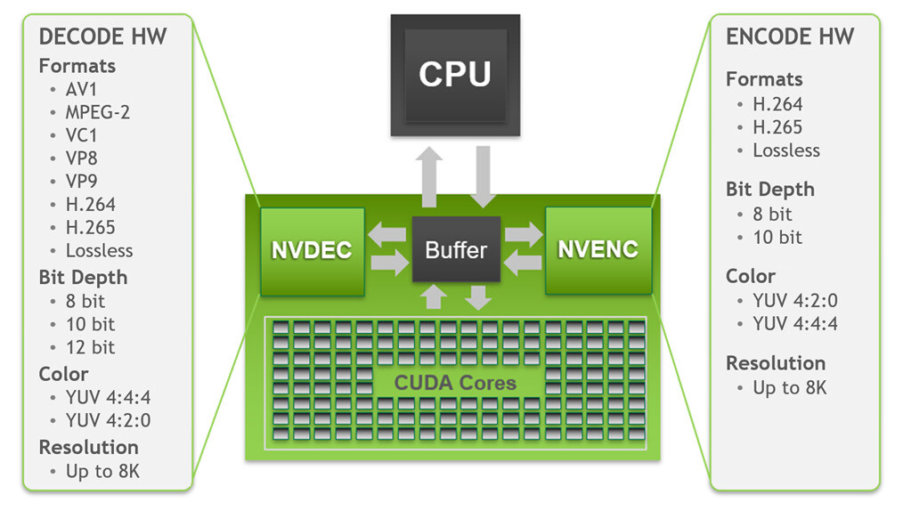NVIDIA NVENC 매트릭스 업데이트(암페어 추가) 2020.10.19 01:51 PC.Div.Soft/News 반응형 NVIDIA의 NVENC 매트릭스에 암페어 GPU의 사양이 업데이트되었습니다. GTX 3070/3080/3090 의 경우 AV1 8/10bit 디코딩을 지원한다고 하니 참조하세요. 반응형 공유하기 게시글 관리 Klein Berry 'PC.Div.Soft > News' 카테고리의 다른 글 첫 인텔 dGPU 탑재 2in1, ASUS VivoBook Flip 14 TP470EZ (0) 2020.10.21 Microsoft, Office 2010/Mac Office 2016 지원 종료 (0) 2020.10.18 Microsoft, Windows 및 Visual Studio용 긴급 보안 패치 배포 (0) 2020.10.18 댓글 공유하기 다른 글 댓글 이 글 공유하기 구독하기 구독하기 카카오톡 카카오톡 라인 라인 트위터 트위터 Facebook Facebook 카카오스토리 카카오스토리 밴드 밴드 네이버 블로그 네이버 블로그 Pocket Pocket Evernote Evernote 다른 글 라즈베리 파이 컴퓨트 모듈 4 발매 라즈베리 파이 컴퓨트 모듈 4 발매 2020.10.21 첫 인텔 dGPU 탑재 2in1, ASUS VivoBook Flip 14 TP470EZ 첫 인텔 dGPU 탑재 2in1, ASUS VivoBook Flip 14 TP470EZ 2020.10.21 Microsoft, Office 2010/Mac Office 2016 지원 종료 Microsoft, Office 2010/Mac Office 2016 지원 종료 2020.10.18 Microsoft, Windows 및 Visual Studio용 긴급 보안 패치 배포 Microsoft, Windows 및 Visual Studio용 긴급 보안 패치 배포 2020.10.18 다른 글 더 둘러보기