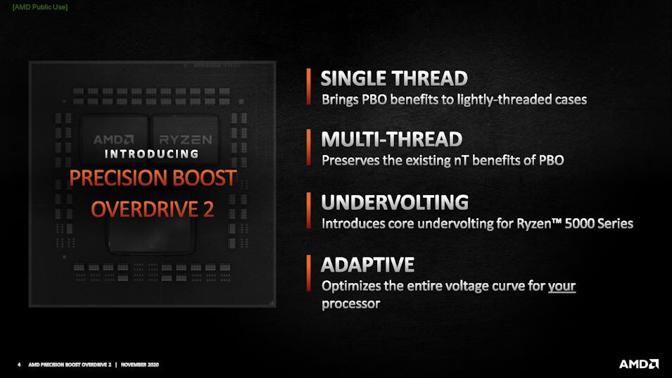 AMD에 따르면 이러한 도구는 작업에 필요한 전압을 동적으로 계산해 최대 초당 1000회의 전압 값을 조정한다고 합니다. 그렇기에 이제 더 낮은 전력 소모와 더 나은 쿨링 효과로 높은 부스트 클럭 유지가 가능해질 것이라고 하네요. AMD에서는 이 기능을 활용하면 단일 스레드 성능의 최대 2%, 멀티 스데드 성능이 최대 10%까지 향상된다고 합니다. 그리고 당연하겠지만 코어 수가 많은 프로세서일 수록 효과가 더 좋으며, BIOS 내에서도 구현되지만 소프트웨어(Ryzen Master)에도 구현할 것이라고 합니다. 다만 5000 시리즈 이전 프로세서의 경우 Ryzen 5000 시리즈와 도입된 기술적인 최적화가 필요하기에 적용되지 않는다고 하네요.