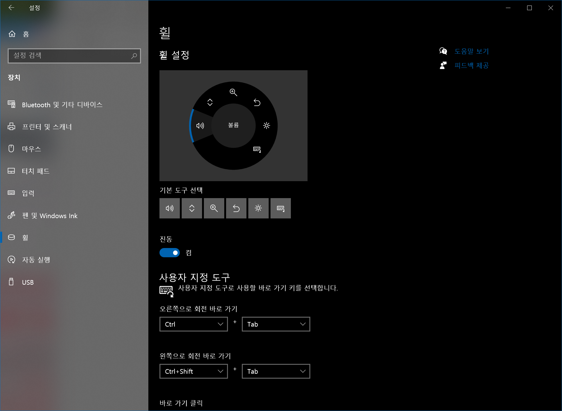 설정 > 장치 > 휠(다이얼 연결하면 생김) > 앱 설정에서 앱별 단축 키로 액션 설정이 가능하긴 하다.