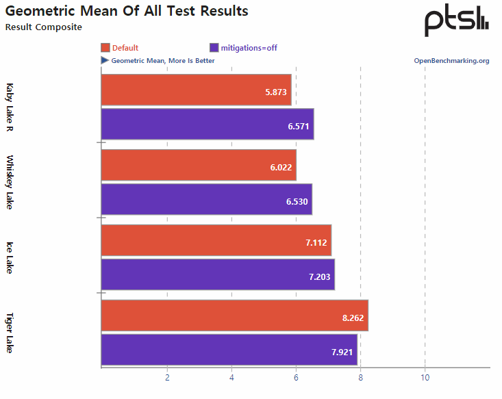 Phoronix에 따르면 최신 Intel Tiger Lake CPU가 장착된 시스템은 우분투 20.10에서 특이하게도 보안 취약점 완화 패치를 비활성화하면 오히려 성능이 하락하는 것으로 나타났다고 합니다. mitigations = off 커널 옵션을 사용해 확인해본 결과라고 하며 Phoronix에서 관련 정보를 확인해 볼 수 있습니다. Kaby Rake R, Whiskey Lake, Ice Lake, Tiger Lake 시스템을 설정해 테스트를 진행했다고 하네요.