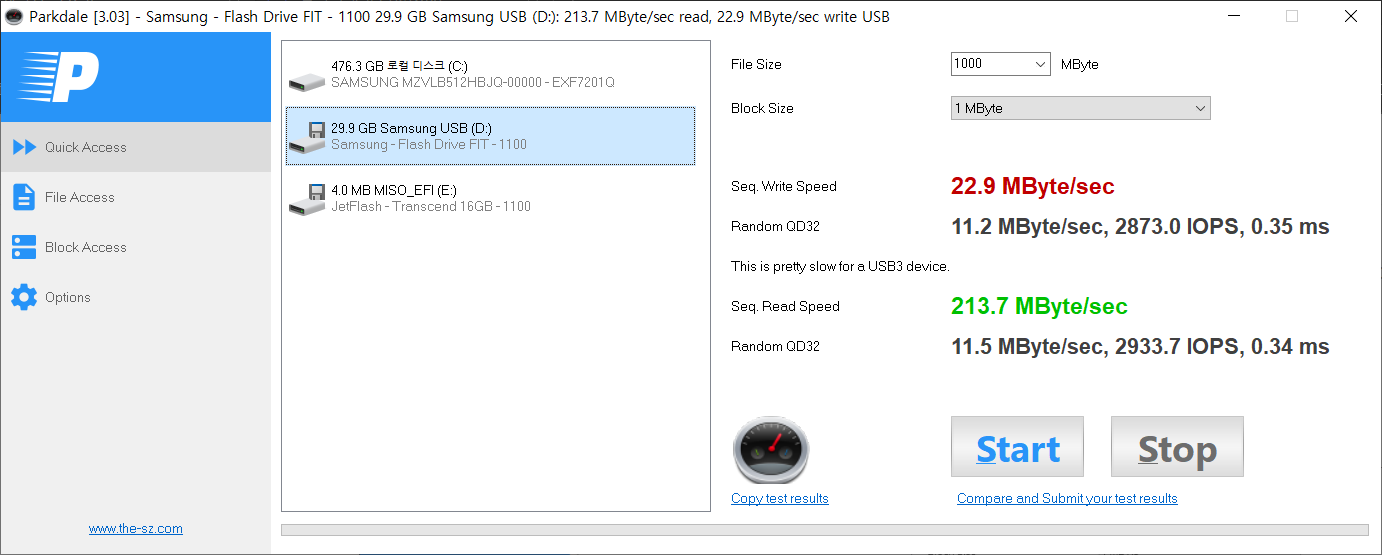 32GB 기준 순차 읽기 200MB/s 이상, 쓰기 22MB/s 정도 나오고, Parkdale이나 AJATest같은 프로그램으로 돌려보면 준수한 성능 보여주고, 생각보다 뜨겁지도 않음. 이전에 커세어 보야져 쓸때와 비교해보면 더 매력적이지 않나 싶다. 그거 진짜 뜨겁고 크기도 컸고.... 이전에 쓰던 128GB(읽기 380MB/s 쓰기 70MB/s정도)도 괜찮고 32GB도 쓰기 속도가 좀 많이 떨어지지만 지속 성능도 괜찮으니 막 굴리면서도 그럭저럭 성능 잘 나오고 크기 작은 플래시 메모리 찾고 있다면 꽤나 추천하고픔. 테스트하느라 parkdale로 20분 정도 읽기 물려놨는데 뜨겁진 않고약간 따듯한 정도라 어떤 용량을 선택해도 무난하지 않나 싶다. 공유기에 물려서 개인 저장소로 쓰기에도 좋은 제품이라고 생각함.