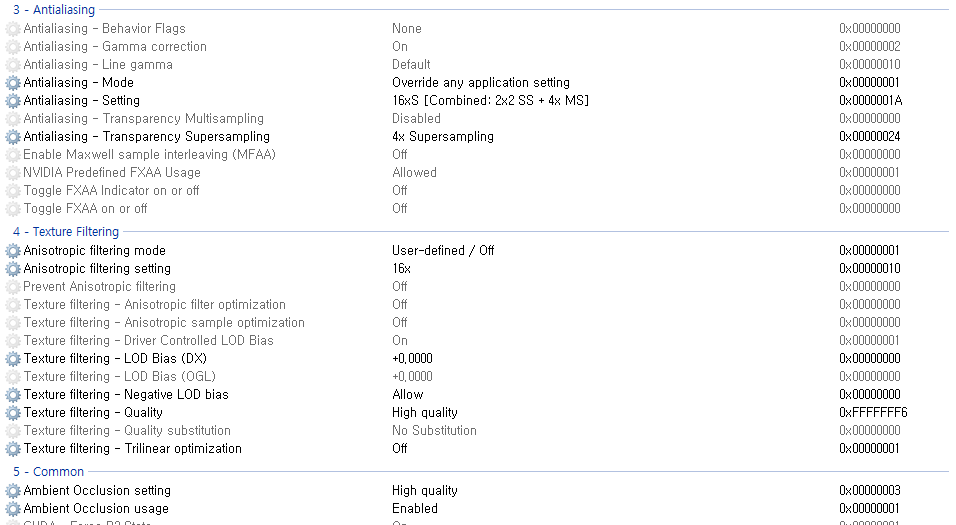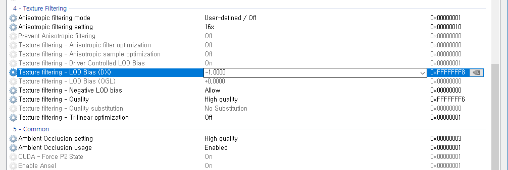 4-Texture Filtering 에서는 Anisotropic filtering mode를 User-defined/off로(드라이버 설정 강제한다는 이야기), Anisotropic filtering setting을 16x로(이건 무조건 16x 줘야함. 안티를 걸면 각 객체들이 뿌옇게 되기에... 개인적으로 멀리 있는 건 흐리게 보이니까 흐려도 상관 없지 않나 싶어 게임 옵션에서는 4x이상 잘 안주는데 SSAA를 드라이버단에서 건다면 무조건 16x 권장), Texture filtering LOD Bias(DX-DirectX)를 -1.000(8xQ 사용하면 -1.5000)으로, Texture filtering - Negative LOD bias를 Allow(SSAA에 따른 흐려짐 방지에 음수값 허용이 필요한데 드라이버에서 자동 관리되기에 허용해줘야 됨)로, Texture filtering - Quality를 Highy quality로, Texture filtering - Trillinear optimization을 off(기본값)로 두면 되겠다.