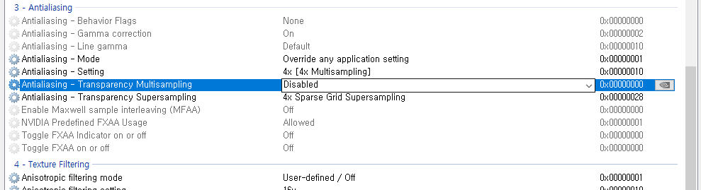 *투명도 필터링(Antialiasing - Transparency Multisampling)에서 Multisampling을 Disable하는 건 여기서 Supersampling을 사용하기 위해서임. 이거 켜두면 여기서 SSAA가 아니라 MSAA가 동작하니까 끔(MSAA는 알파값을 가지는 개체의 안티를 구현하지 못함). 가끔 기껏 설정 다하고도 이거 Enable하는 사람들 보여서 이야기해봄. 성능 때문인가....?