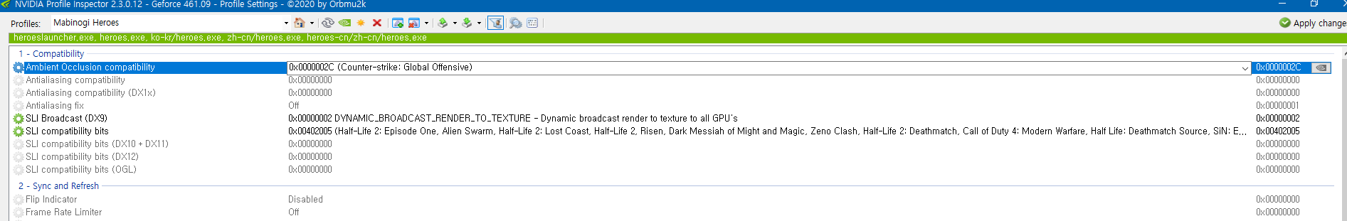 프로파일 인스펙터 실행 후 Profiles: 란에 heroes검색하면 heroes.exe 에 관한 설정이 가능해진다. mabinogi:heroes 라는 프로파일도 있는데 대만/일본 전섭 용이라 그런지 여기 적용하면 올바르게 설정이 안 먹으니 heroes에다 해 주자. 아니면 mabinogi:heroes 프로파일에 적용할 애플리케이션 추가 눌러서 heroes.exe 추가해도 무방하니 마음에 드는 걸로 골라 잡읍시다.