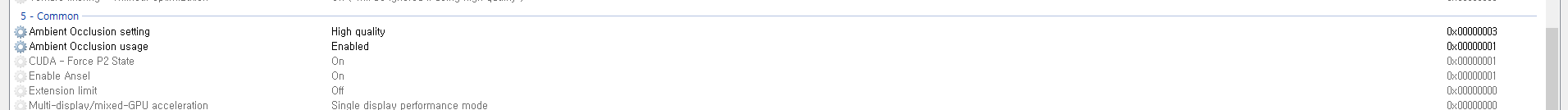 그 외에 5-Common에서 설정할 값은 Power management mode를 Prefer maximum performance로 바꿔주고, Shaderchache를 off로 하는 값들을 추천하는데 쉐이더캐시 설정으로 HDD에서 게임을 읽느라 갑자기 버벅대거나 하는 현상이 있었던 옛 게임들이 있고, 전력 상태 변화에 따른 프레임하락을 싫어하는 사용자라면 바꿔도 상관 없다고는 보는데 난 그냥 기본값으로 사용중. 2021년에 성능이 남아돌아 설정하는 거니까 그냥 둬도 무방.