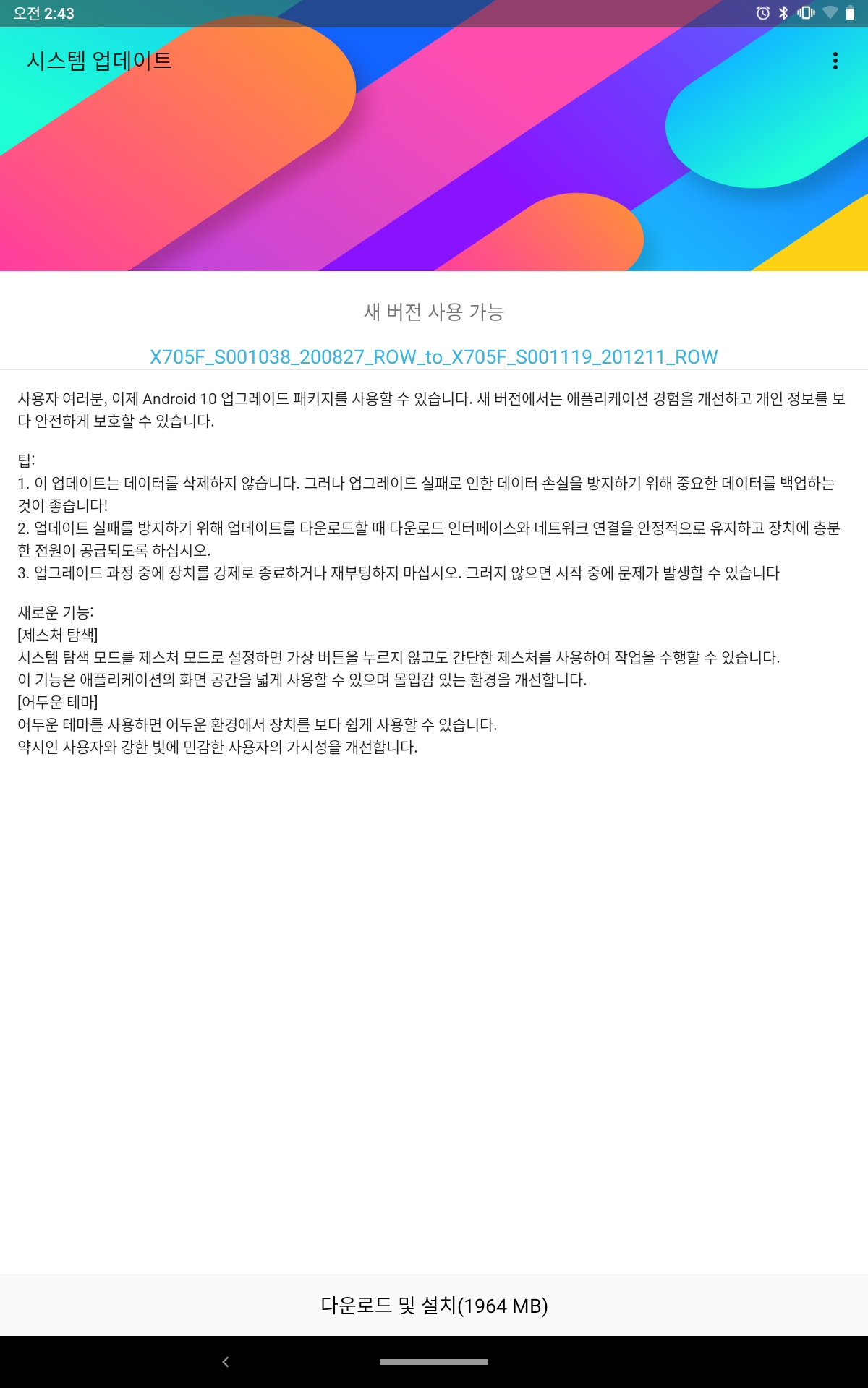 안드로이드 업데이트 매트릭스에 등록된 대로 요가탭 10.1의 안드로이드 10 기반 업데이트가 진행된 듯. 밤에 체크해보니까 업데이트되고, 업데이트 시간은 생각보다 얼마 안 걸렸음. 다운로드 받는데 더 오래 걸린 것 같음.