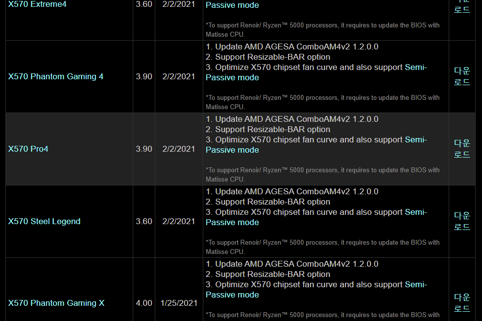 v 1.2.0.0 기반의 BIOS 업데이트에는 Resize-BAR 옵션 추가 및 X570 칩셋의 팬이 온도가 높을 때에만 동작하는 기능이 추가되었다고(기본값인듯)하니 참조하세요.