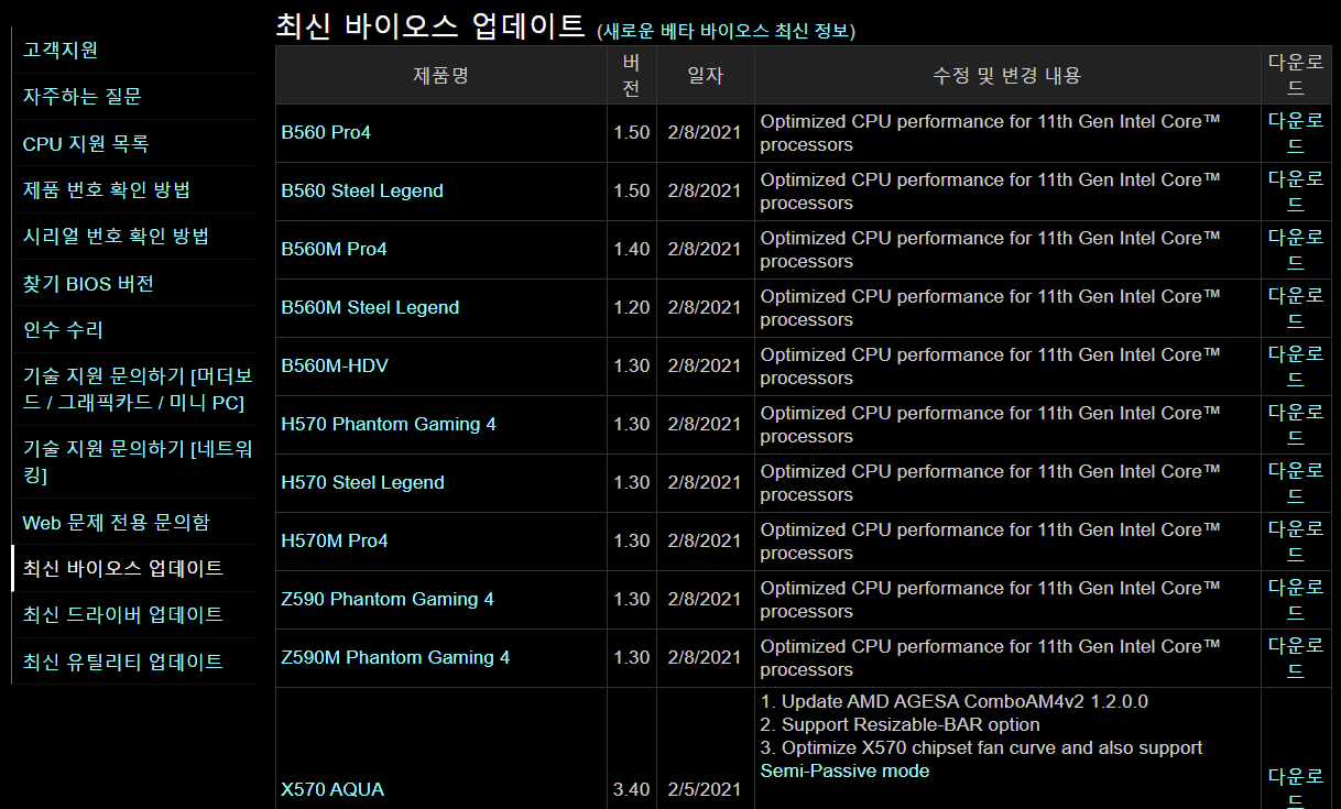 ASRock, 자사 Intel 500시리즈 칩셋 기반 머더보드 BIOS 업데이트 2021.02.08 21:44 PC.Div.Soft/Driver.Firmware 반응형 ASRock 홈페이지에 Intel 500시리즈 기반 칩셋 제품군의 신규 BIOS가 등록되었습니다. 업데이트 내역은 11세대 Intel Core 프로세서 성능 최적화하고 하니 사용하시는 분들은 업데이트를 챙겨보시기 바랍니다. 반응형 공유하기 게시글 관리 Klein Berry 'PC.Div.Soft > Driver.Firmware' 카테고리의 다른 글 ASUS TUF B450M-PLUS GAMING BIOS 업데이트 (0) 2021.02.10 ASRock, Radeon RX 6800 PGD 16G OC/C Pro 16G OC BIOS 업데이트 (0) 2021.02.04 ASRock, 자사 X570 머더보드에 AGESA 1.2.0.0 기반 BIOS업데이트 (0) 2021.02.04 댓글 공유하기 다른 글 댓글 이 글 공유하기 구독하기 구독하기 카카오톡 카카오톡 라인 라인 트위터 트위터 Facebook Facebook 카카오스토리 카카오스토리 밴드 밴드 네이버 블로그 네이버 블로그 Pocket Pocket Evernote Evernote 다른 글 GIGABYTE B450M DS3H BIOS 업데이트 GIGABYTE B450M DS3H BIOS 업데이트 2021.02.10 ASUS TUF B450M-PLUS GAMING BIOS 업데이트 ASUS TUF B450M-PLUS GAMING BIOS 업데이트 2021.02.10 ASRock, Radeon RX 6800 PGD 16G OC/C Pro 16G OC BIOS 업데이트 ASRock, Radeon RX 6800 PGD 16G OC/C Pro 16G OC BIOS 업데이트 2021.02.04 ASRock, 자사 X570 머더보드에 AGESA 1.2.0.0 기반 BIOS업데이트 ASRock, 자사 X570 머더보드에 AGESA 1.2.0.0 기반 BIOS업데이트 2021.02.04 다른 글 더 둘러보기