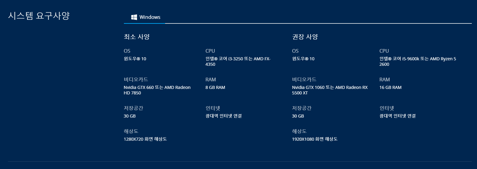 일단 최소/권장 사양 모두 OS는 윈도10 전용이고, 최소사양의 경우 Intel Core i3-3250/AMD FX-4350, 8GB 시스템 메모리, 30GB 디스크 공간, Geforce GTX 660/Radeon HD 7850, 권장 사양의 경우 Intel Core i5-9600K/AMD Ryzen 5 2600X, 16GB 시스템 메모리, GTX 1060/Radeon RX 5500XT, 30GB 디스크 공간이라고 하니 참조합시다.