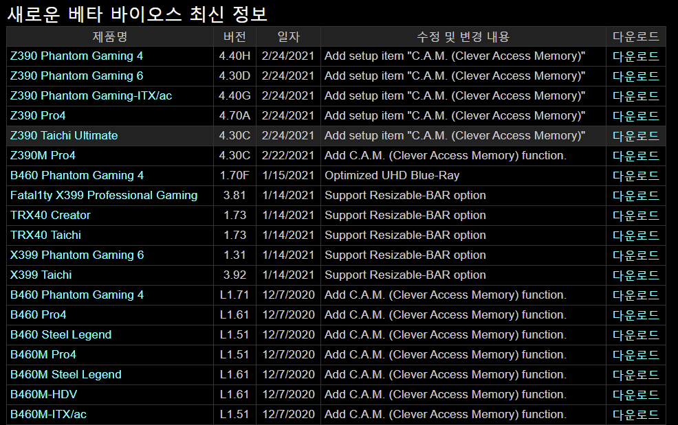 ASRock, 자사 Intel Z390 시리즈 머더보드에 C.A.M 구현 BETA BIOS 업데이트 2021.02.25 15:53 PC.Div.Soft/Driver.Firmware 반응형 ASRock이 자사의 일부 Intel 300(Z390)시리즈 머더보드에 C.A.M(Clever Access Memory)기능을 구현한 BETA BIOS를 업데이트하고 있습니다. 베타 바이오스인 만큼 사용에 주의를 가하시고, 언제 업데이트된 버전이 사라질 지 모르니 미리 받아두셔도 나쁠 건 없지 않나 싶습니다. 반응형 공유하기 게시글 관리 Klein Berry 'PC.Div.Soft > Driver.Firmware' 카테고리의 다른 글 Logitech G HUB 2021.1.492업데이트 (0) 2021.02.26 AQUANTIA 윈도10 드라이버 업데이트(2.1.21) (0) 2021.02.21 INTEL 82579V CODE 10 에러 (0) 2021.02.21 댓글 공유하기 다른 글 댓글 이 글 공유하기 구독하기 구독하기 카카오톡 카카오톡 라인 라인 트위터 트위터 Facebook Facebook 카카오스토리 카카오스토리 밴드 밴드 네이버 블로그 네이버 블로그 Pocket Pocket Evernote Evernote 다른 글 Intel, 무선 어댑터 드라이버 업데이트(윈도10) Intel, 무선 어댑터 드라이버 업데이트(윈도10) 2021.03.01 Logitech G HUB 2021.1.492업데이트 Logitech G HUB 2021.1.492업데이트 2021.02.26 AQUANTIA 윈도10 드라이버 업데이트(2.1.21) AQUANTIA 윈도10 드라이버 업데이트(2.1.21) 2021.02.21 INTEL 82579V CODE 10 에러 INTEL 82579V CODE 10 에러 2021.02.21 다른 글 더 둘러보기