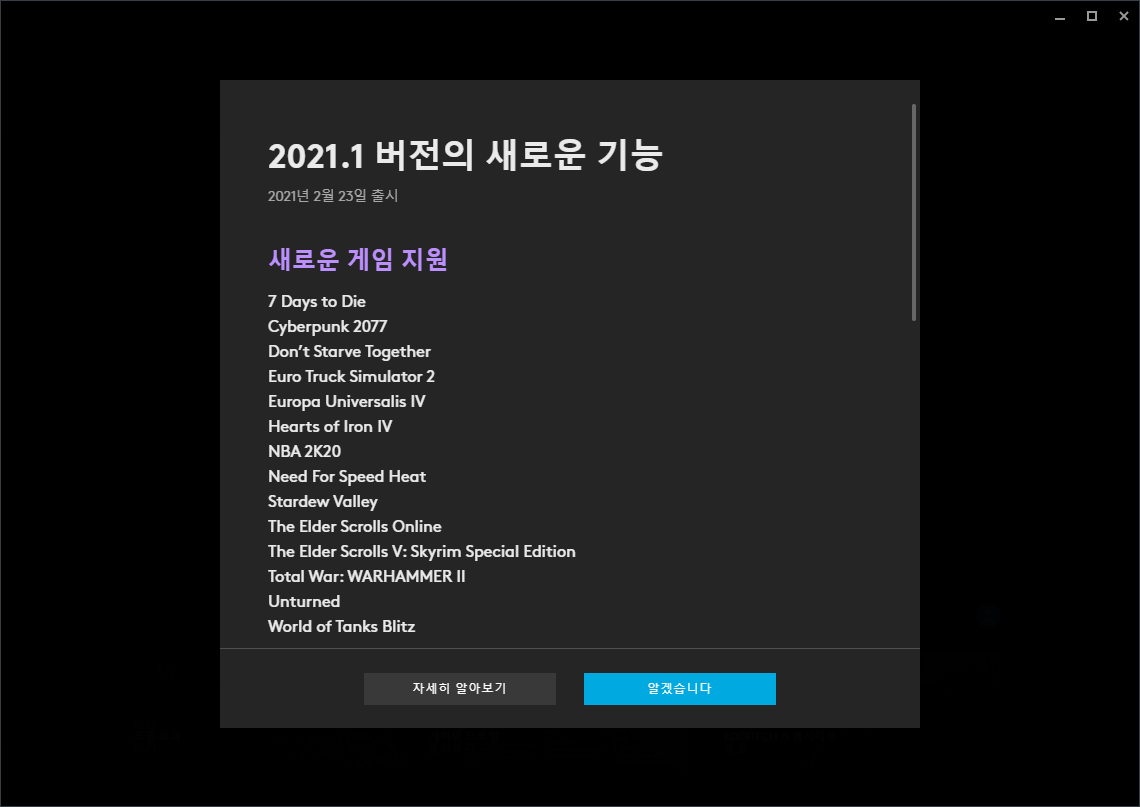 Logitech G HUB 2021.1.492업데이트 2021.02.26 07:34 PC.Div.Soft/Driver.Firmware 반응형 로지텍의 게임 기어 소프트웨어인 G HUB의 업데이트가 진행되었습니다. NBA2K20, Stardwe Valley 등의 새로운 게임 지원과 더불어 여러가지 버그 수정(장치 상태 점검 리뉴얼, 화면 샘플러 성능 개선, LUA 스크립트 작성 버그 수정 등)이 이루어졌고 이전버전에 이어 인스톨러의 개선(C++재배포 패키지 확인 기능 추가)도 이루어졌다고 하니 참조하세요. 반응형 공유하기 게시글 관리 Klein Berry 'PC.Div.Soft > Driver.Firmware' 카테고리의 다른 글 Intel, 무선 어댑터 드라이버 업데이트(윈도10) (0) 2021.03.01 ASRock, 자사 Intel Z390 시리즈 머더보드에 C.A.M 구현 BETA BIOS 업데이트 (0) 2021.02.25 AQUANTIA 윈도10 드라이버 업데이트(2.1.21) (0) 2021.02.21 댓글 공유하기 다른 글 댓글 이 글 공유하기 구독하기 구독하기 카카오톡 카카오톡 라인 라인 트위터 트위터 Facebook Facebook 카카오스토리 카카오스토리 밴드 밴드 네이버 블로그 네이버 블로그 Pocket Pocket Evernote Evernote 다른 글 iFi Audio zen dac 펌웨어 업데이트(7.x 버전) iFi Audio zen dac 펌웨어 업데이트(7.x 버전) 2021.03.02 Intel, 무선 어댑터 드라이버 업데이트(윈도10) Intel, 무선 어댑터 드라이버 업데이트(윈도10) 2021.03.01 ASRock, 자사 Intel Z390 시리즈 머더보드에 C.A.M 구현 BETA BIOS 업데이트 ASRock, 자사 Intel Z390 시리즈 머더보드에 C.A.M 구현 BETA BIOS 업데이트 2021.02.25 AQUANTIA 윈도10 드라이버 업데이트(2.1.21) AQUANTIA 윈도10 드라이버 업데이트(2.1.21) 2021.02.21 다른 글 더 둘러보기