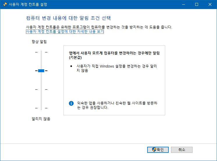 윈도 10, UAC끄기 2021.03.08 15:34 PC.Div.Soft/Windows.Office 반응형 난 이거 끄는걸 권장하지 않는데 서브컴이라 괜찮다고 끄는 방법 알려달라길래 이것도 포스팅. 간단하다. 시작 누르고 uac 라고 입력하면 [사용자 계정 설정 변경]이라고 뜨는데 여기서 설정 가능. 내 경우엔 XP시절부터 켜고 쓰고 있기에 잘 모르겠지만 아무튼 불편한 사람이 있다면 끄고 켤 수 있도록 합시다. 반응형 공유하기 게시글 관리 Klein Berry 'PC.Div.Soft > Windows.Office' 카테고리의 다른 글 윈도 10, 업데이트 고급 설정하기 (0) 2021.03.10 윈도10) 작업 표시줄 프로그램 이름 나오게 하기 (0) 2021.03.08 윈도10 프리뷰, 작업 표시줄 개선 (0) 2021.03.04 댓글 공유하기 다른 글 댓글 이 글 공유하기 구독하기 구독하기 카카오톡 카카오톡 라인 라인 트위터 트위터 Facebook Facebook 카카오스토리 카카오스토리 밴드 밴드 네이버 블로그 네이버 블로그 Pocket Pocket Evernote Evernote 다른 글 Windows 10 KB5000802 업데이트, 프린트에서 블루스크린 유발 Windows 10 KB5000802 업데이트, 프린트에서 블루스크린 유발 2021.03.11 윈도 10, 업데이트 고급 설정하기 윈도 10, 업데이트 고급 설정하기 2021.03.10 윈도10) 작업 표시줄 프로그램 이름 나오게 하기 윈도10) 작업 표시줄 프로그램 이름 나오게 하기 2021.03.08 윈도10 프리뷰, 작업 표시줄 개선 윈도10 프리뷰, 작업 표시줄 개선 2021.03.04 다른 글 더 둘러보기
