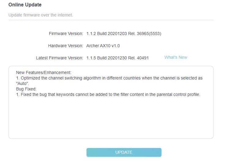 TP-LINK AX10 펌웨어 업데이트(V1.0) 2021.03.10 02:04 ETC.Mobile/Router.Wireless 반응형 V1.20의 경우 먼저 업데이트가 진행되었는데 V1.0역시 이번에 업데이트가 진행되는 듯. 버전 및 빌드는 1.1.5 Build 20201230 Rel. 40491(5553)이고, 업데이트 내역은 채널 자동 설정일때 채널 전환 알고리즘 개선, 자녀 보호 기능 프로필에 키워드 추가 안되는 버그 수정이라고 하니 참조하세욥. 반응형 공유하기 게시글 관리 Klein Berry 'ETC.Mobile > Router.Wireless' 카테고리의 다른 글 TP-LINK Archer C7 V5 펌웨어 업데이트 (0) 2021.03.10 D-Link, DIR-850L(W)/B1 모델 펌웨어 v2.28KR 업데이트 (0) 2021.02.25 TP-LINK AX10 공유기, OFDMA 끄기 (0) 2021.02.21 댓글 공유하기 다른 글 댓글 이 글 공유하기 구독하기 구독하기 카카오톡 카카오톡 라인 라인 트위터 트위터 Facebook Facebook 카카오스토리 카카오스토리 밴드 밴드 네이버 블로그 네이버 블로그 Pocket Pocket Evernote Evernote 다른 글 EFM, ipTIME AX3004ITL 공유기 베타 펌웨어 업데이트(14.01.9) EFM, ipTIME AX3004ITL 공유기 베타 펌웨어 업데이트(14.01.9) 2021.03.12 TP-LINK Archer C7 V5 펌웨어 업데이트 TP-LINK Archer C7 V5 펌웨어 업데이트 2021.03.10 D-Link, DIR-850L(W)/B1 모델 펌웨어 v2.28KR 업데이트 D-Link, DIR-850L(W)/B1 모델 펌웨어 v2.28KR 업데이트 2021.02.25 TP-LINK AX10 공유기, OFDMA 끄기 TP-LINK AX10 공유기, OFDMA 끄기 2021.02.21 다른 글 더 둘러보기