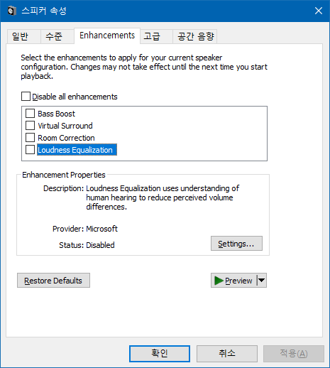 MS의 윈도10도 업데이트되고, 사운드 소프트웨어+하드웨어 제조사의 드라이버가 업데이트되면서 이전에는 소리 > 재생 탭 > 재생장치의 속성의 Enhancements 탭에서 이런 설정이 가능했는데 안되는 경우가 있더라. 이 경우 대게 드라이버 설치할 때 같이 설치되는 프로그램에서 제어하기에 이러한 설정이 안되는 듯.
