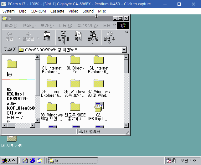 쓰기 편하게 ISO로 만들어서 압축함. 윈도 98 KOR SE 이미지는 winworldpc에서 구하고, 업데이트 모음팩은 oscc.kr에서 구해서 테스트해봄. 고마워요 주인장님! 아래는 텍스트 내용이니까 미리 읽어보고 설치하도록 합시다.