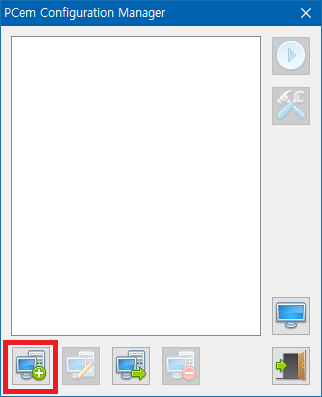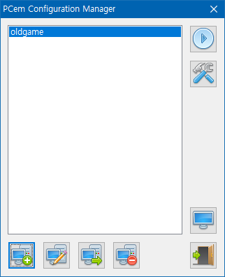 그럼 이제 본격적으로 프로그램 실행 후, 가상 머신을 추가해 주도록 합시다. VirtualBox 등과 달리 크게 만질 건 없다. 저기 가상 머신 추가(New) 버튼 눌러서 생성할 가상 머신 이름 지정해주면, 이후 PCem 설정창이 뜬다. 여기서 설정한 이름이 가상 머신 목록에 나타나게 됨.