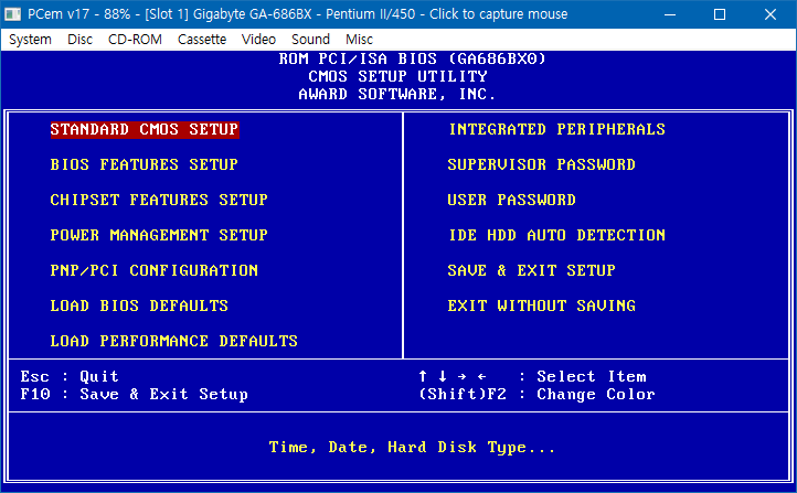 오오 파란화면 오오...시간 설정은 참고로 PCem에서 설정했다면 알아서 동기화하니까 건드릴 거 없다. BIOS의 키는 아래에도 적혀있지만 방향키 + 값 변화는 PgDn/PgUp(+/-키도 가능) + 취소 ECS키 쓰면 된다. 왼쪽 아래 두개 LOAD BIOS/PERFORMANCE DEFAULTS값은 공장 값 기준 호환성 초기화/설정 성능 최대값 초기화니까(보드마다 다른데 이 보드는 이런듯) 보통은 한번씩은 쓰는 기능이 되는데, 애뮬레이션 상태에 영향을 주는 건 아니니까 여기선 딱히 쓸 일이 없지 않나 싶다. 다만 이것저것 만져보다 이상하다 싶으면 여기서 저거 선택해주면 초기값으로 돌아가니 알고만 있도록 합시다.