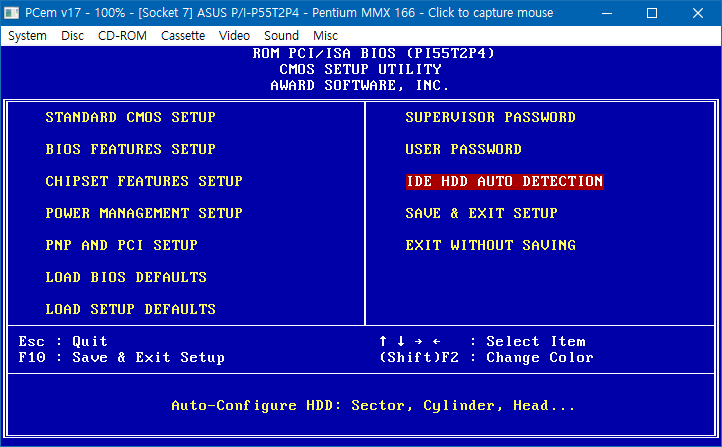 이대로 써도 상관없지만 부팅 순서 정도는 잡아줘야 하니까 DEL 눌러서 BIOS 진입하자. 호스트키는 Ctrl(왼)+END, 전체화면은 Ctrl(왼)+Alt(왼)+PgDn이다. 메뉴에 커서 올려보면 단축키 나오니까 저거 두 개 정도는 외우고 있자. 근데 안그래도 알탭은 안 먹으니 이상하다 싶으면 ALT-TAB/Ctrl+Alt+Del누르면 PCem/호스트OS의 전환이 가능하다(윈도의 경우).