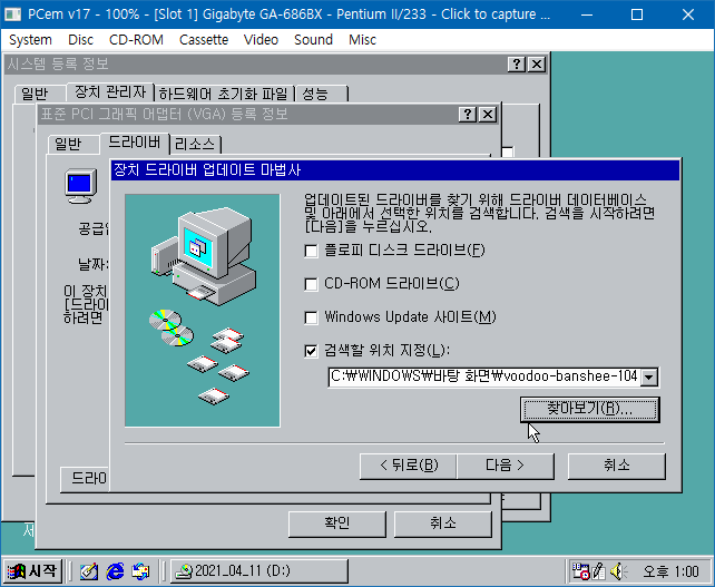 드라이버 설치 방법은 생각보다 간단하다. voodoo-avoodoo-banshee-10400 폴더 복사하고, 내 컴퓨터- 등록 정보 - 시스템 등록 정보에서 장치 관리자 열고, 디스플레이 어댑터 + 표준 PCI 그래픽 어댑터(VGA) 더블 클릭해서 등록 정보 띄운 뒤, 드라이버 탭에서 드라이버 업데이트 - 장치 드라이버 업데이트 마법사에서 위치 지정하고 부두 밴시 드라이버 설치해주면 됨.