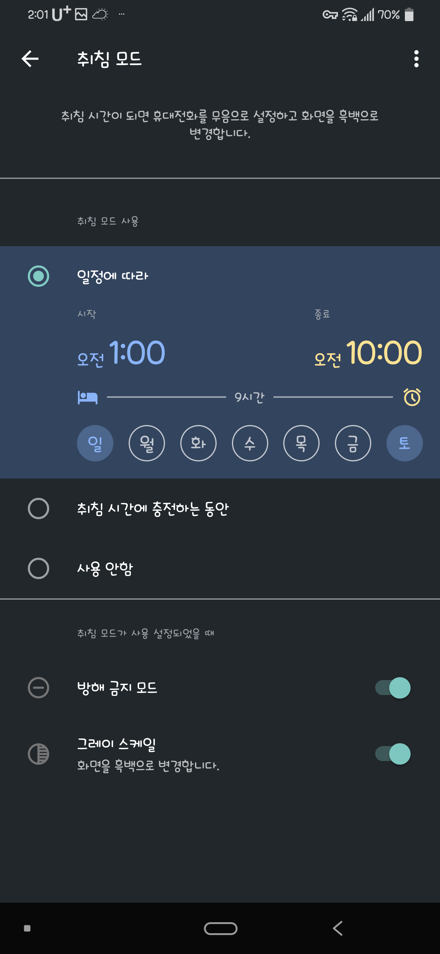 그리고 취짐 모드 시간 설정하면 화면 그레이 스케일, 방해 금지 모드를 켜지게 할 수 있다. 가령 12시-6시반 지정해두면 10시쯤 선 알림(취침 모드 할거라는 알림)해주고, 12시부터 6시반까지 그레이스케일로 만들어주고, 방해 금지 켜져서 문자 알림 등도 거의 칼같이 무음으로 만들어줌. 사실 더 편한건 그냥 스마트 스피커 하나 사는게; 더 편하더라만은...;