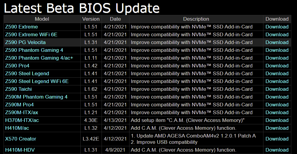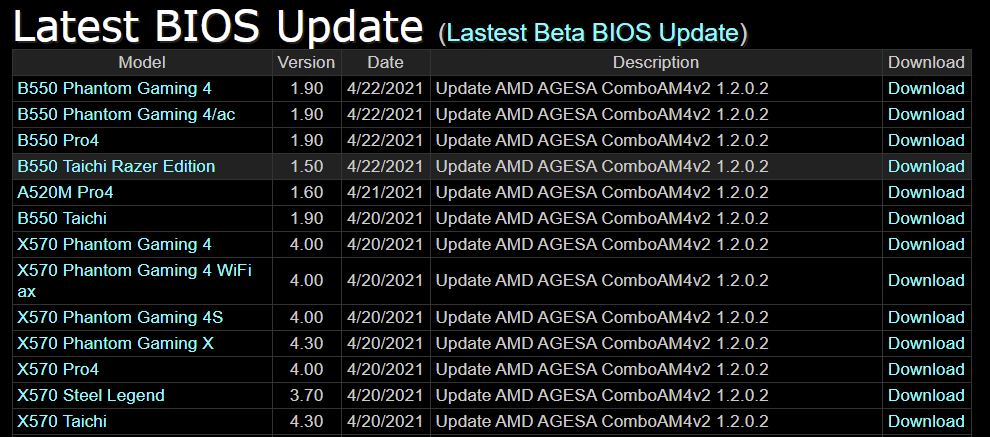 ASRock, 자사 AMD 500시리즈 AGESA 1.2.0.2 기반 BIOS 업데이트 2021.04.22 20:37 PC.Div.Soft/Driver.Firmware 반응형 ASRock이 자사의 X570/B550 칩셋 머더보드용 AGESA ComboAM4v2 1.2.0.2 기반의 BIOS를 업데이트했습니다. 베타가 아니라 정식이고, 별다른 업데이트와 관련한 설명은 없고 단순 AGESA 버전 업데이트만 내역에 나와 있네요. 그리고 Intel Z590칩셋 머더보드의 BETA BIOS 업데이트도 있으니 확인해 보세요. NVMe SSD 애드인 카드와의 호환성 향상이 주된 업데이트 내역이라고 합니다. 반응형 공유하기 게시글 관리 Klein Berry 'PC.Div.Soft > Driver.Firmware' 카테고리의 다른 글 ASRock X570/B550/X370 등 BIOS 업데이트 소식 (0) 2021.04.27 MSI, 자사 일부 X470/B450 머더보드에도 AGESA 1.2.0.2 기반 베타 BIOS 출시 (0) 2021.04.20 Bee-Link T4 BIOS 업데이트(MPC32.W.V0.08.AZW_T4) (0) 2021.04.20 댓글 공유하기 다른 글 댓글 이 글 공유하기 구독하기 구독하기 카카오톡 카카오톡 라인 라인 트위터 트위터 Facebook Facebook 카카오스토리 카카오스토리 밴드 밴드 네이버 블로그 네이버 블로그 Pocket Pocket Evernote Evernote 다른 글 Realtek PCIe FE / GBE / 2.5G 드라이버 10.048 업데이트 Realtek PCIe FE / GBE / 2.5G 드라이버 10.048 업데이트 2021.04.29 ASRock X570/B550/X370 등 BIOS 업데이트 소식 ASRock X570/B550/X370 등 BIOS 업데이트 소식 2021.04.27 MSI, 자사 일부 X470/B450 머더보드에도 AGESA 1.2.0.2 기반 베타 BIOS 출시 MSI, 자사 일부 X470/B450 머더보드에도 AGESA 1.2.0.2 기반 베타 BIOS 출시 2021.04.20 Bee-Link T4 BIOS 업데이트(MPC32.W.V0.08.AZW_T4) Bee-Link T4 BIOS 업데이트(MPC32.W.V0.08.AZW_T4) 2021.04.20 다른 글 더 둘러보기