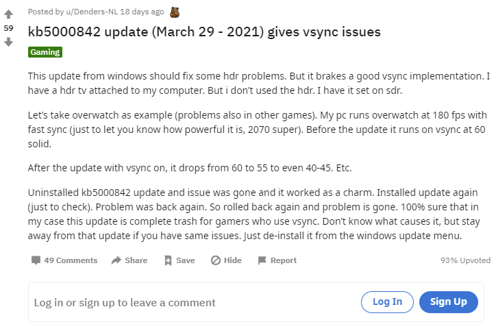 Reddit과 NVIDIA 포럼에 마이크로소프트가 4월 13일에 배포한 Windows 10 20H2용 누적 패치 KB5001330을 적용한 이후 게임 성능이 떨어진다는 보고가 있습니다. 이러한 현상은 이전(3월29일)에 배포된 KB500842에서도 일어난 현상이라고 하네요. 가능하다면 MS의 지원이나 수정을 기다려 보는게 좋지 않나 싶습니다만, 일단 저 두 업데이트를 제거(설정 > 업데이트 및 보안 > 업데이트 내역 보기 > 업데이트 제거)하면 현상이 완화된다고 하니 참조하세요.