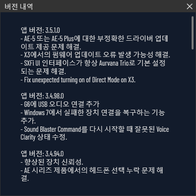 홈페이지에 아직 등록은 안되었는데, 커맨드 앱 내에서 업데이트 체크를 하면 업데이트를 진행합니다. 앱 버전 3.5.10이라고 하며 AE-5/AE-5 Plus 업데이트 문제 해결, X3 펌웨어 업데이트 오류 가능성 해결 등이 이루어졌다고 합니다. 아직 X3의 신규 펌웨어나 G6 등의 개선 펌웨어 같은 건 등록이 안된 것 같은데 펌웨어 기본 값 복구 후 나타나는 USB 오디 관련 무작위 팝노이즈 문제를 해결했다고 하는 Katana 제품의 신규 펌웨어(v2.1)는 홈페이지에 등록되었네요.